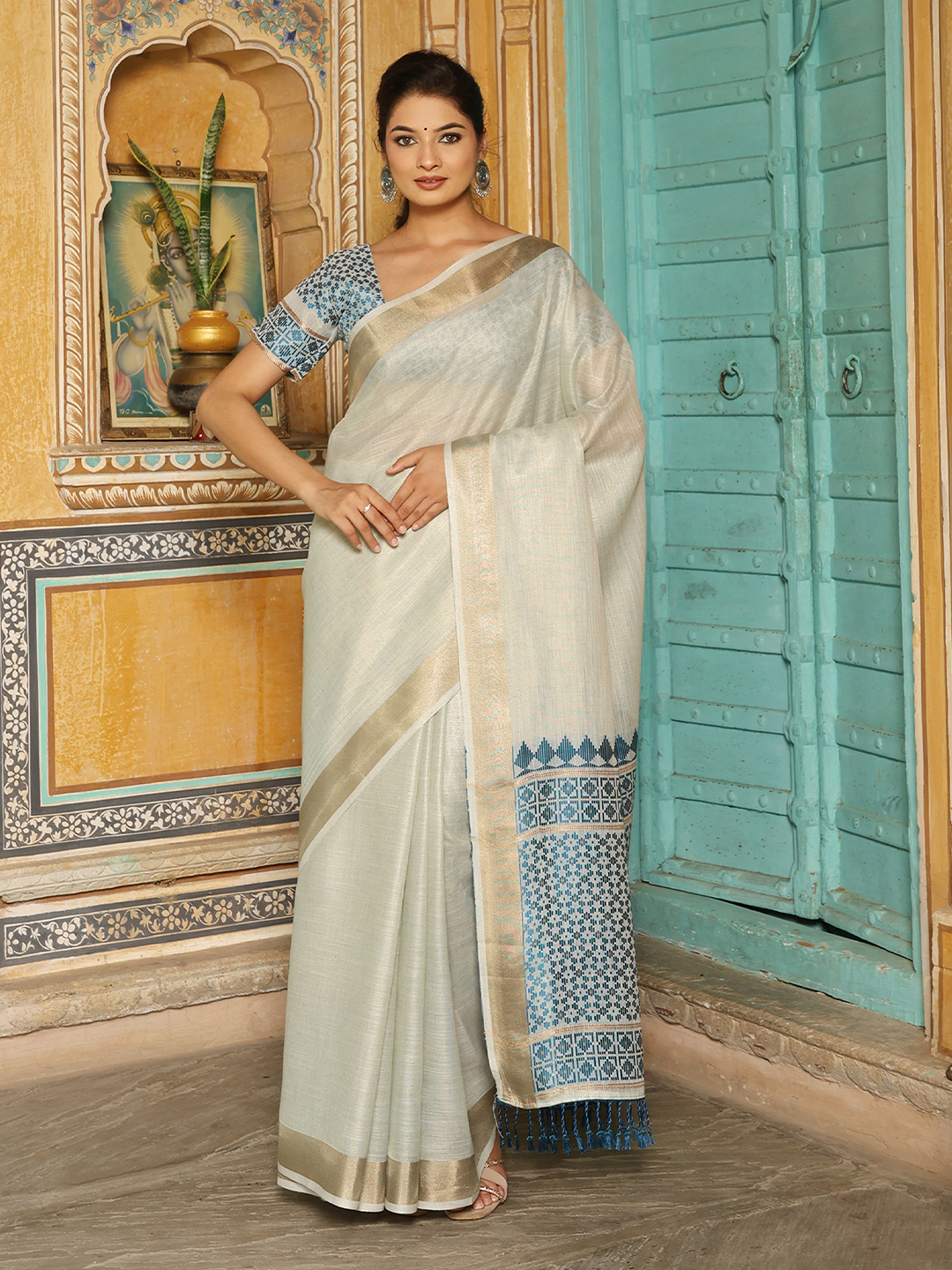 Sky Blue Color Linen Fabric Woven Designer Beautiful Fancy Saree