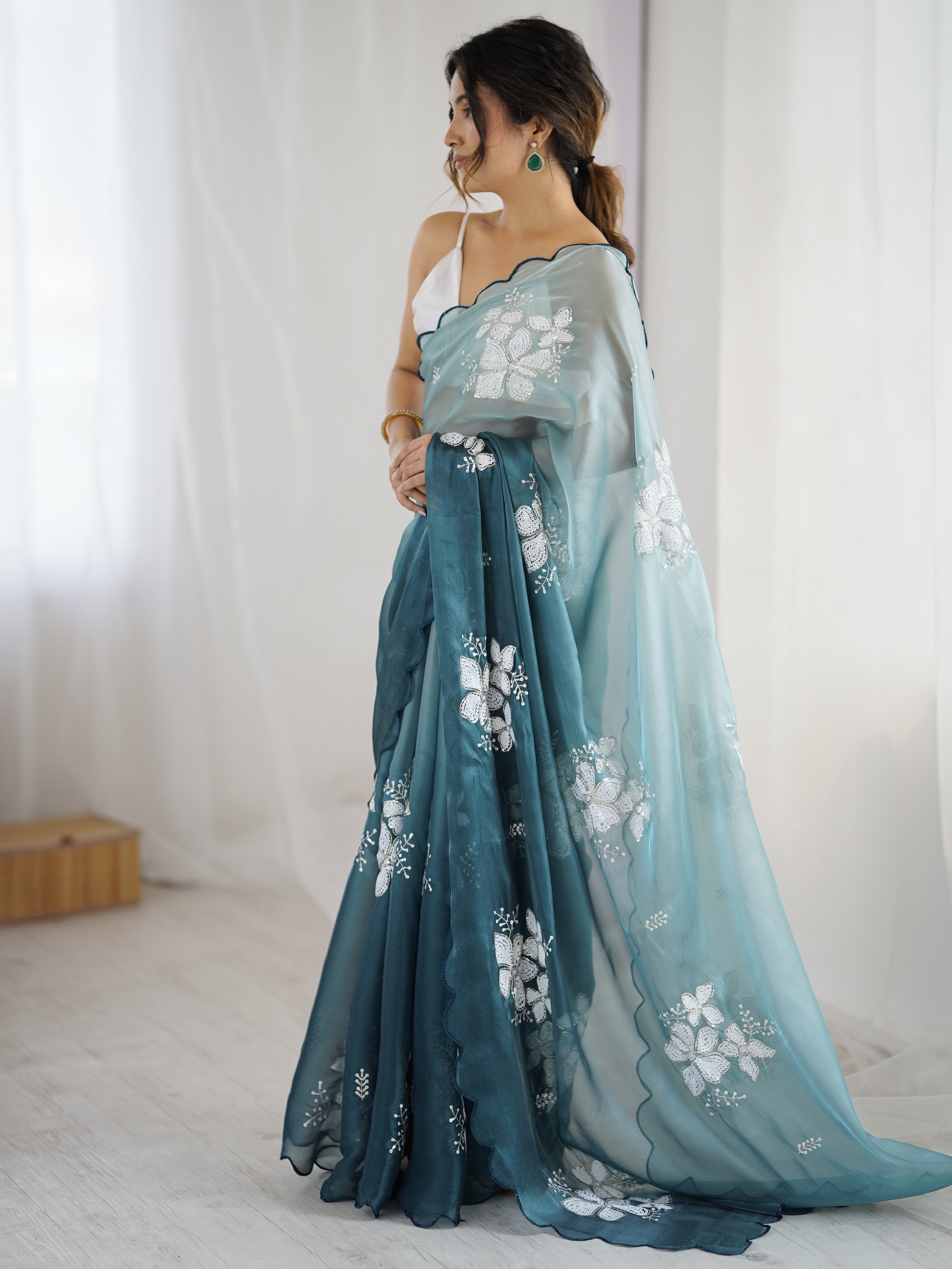 Teal Color Glamorous Jimmy Choo Fabric Beautiful Embroidered Saree