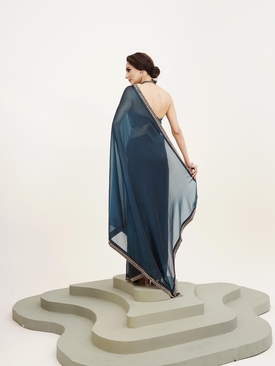 Teal Color Satin Fabric Embellished Beads and Stones Work Fancy Saree