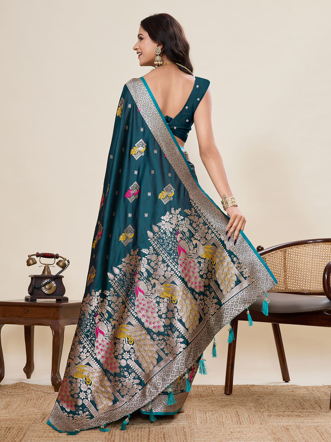 Teal Color Two Tone Satin Silk Saree For Rich Sophisticated Looks