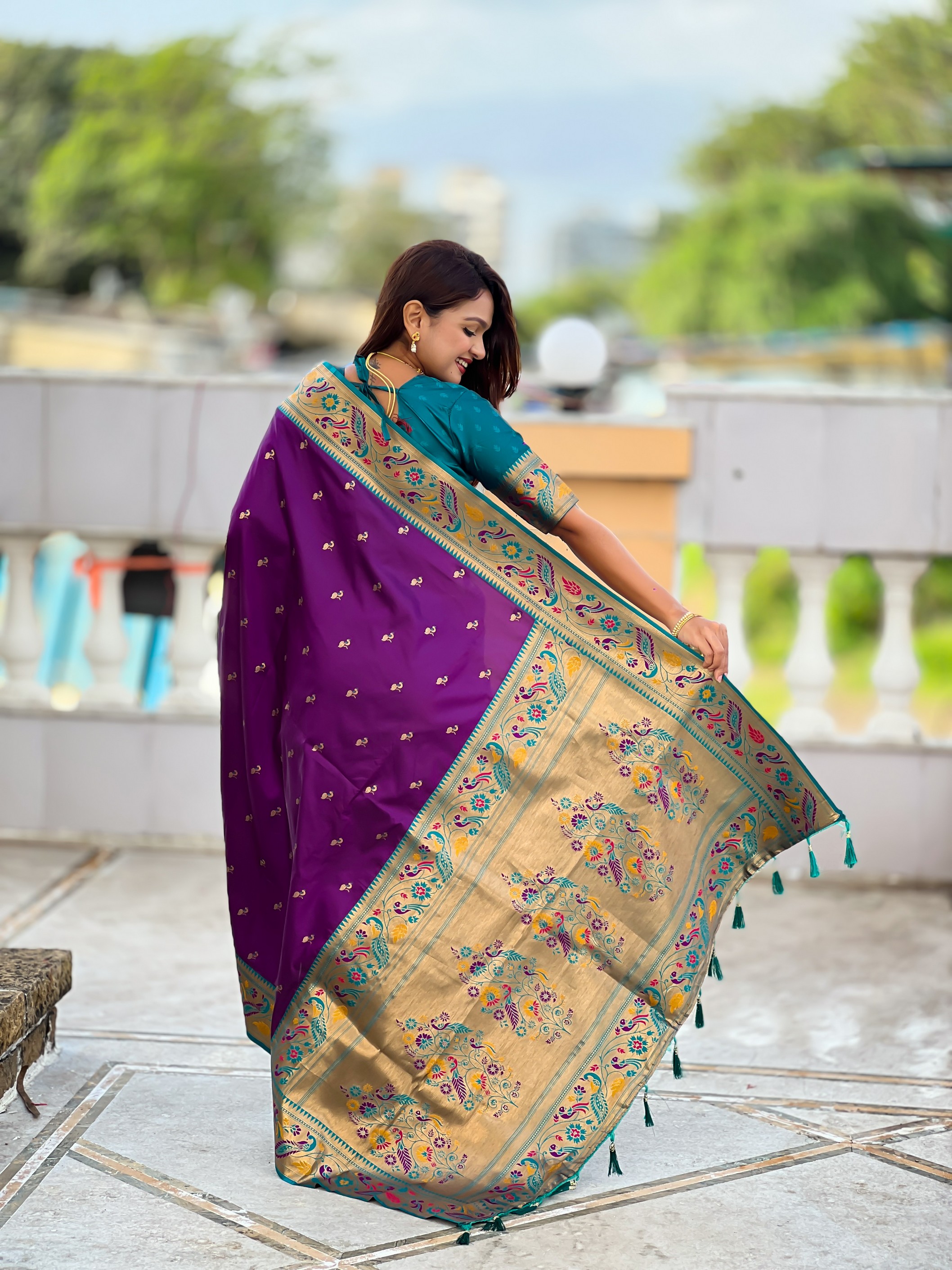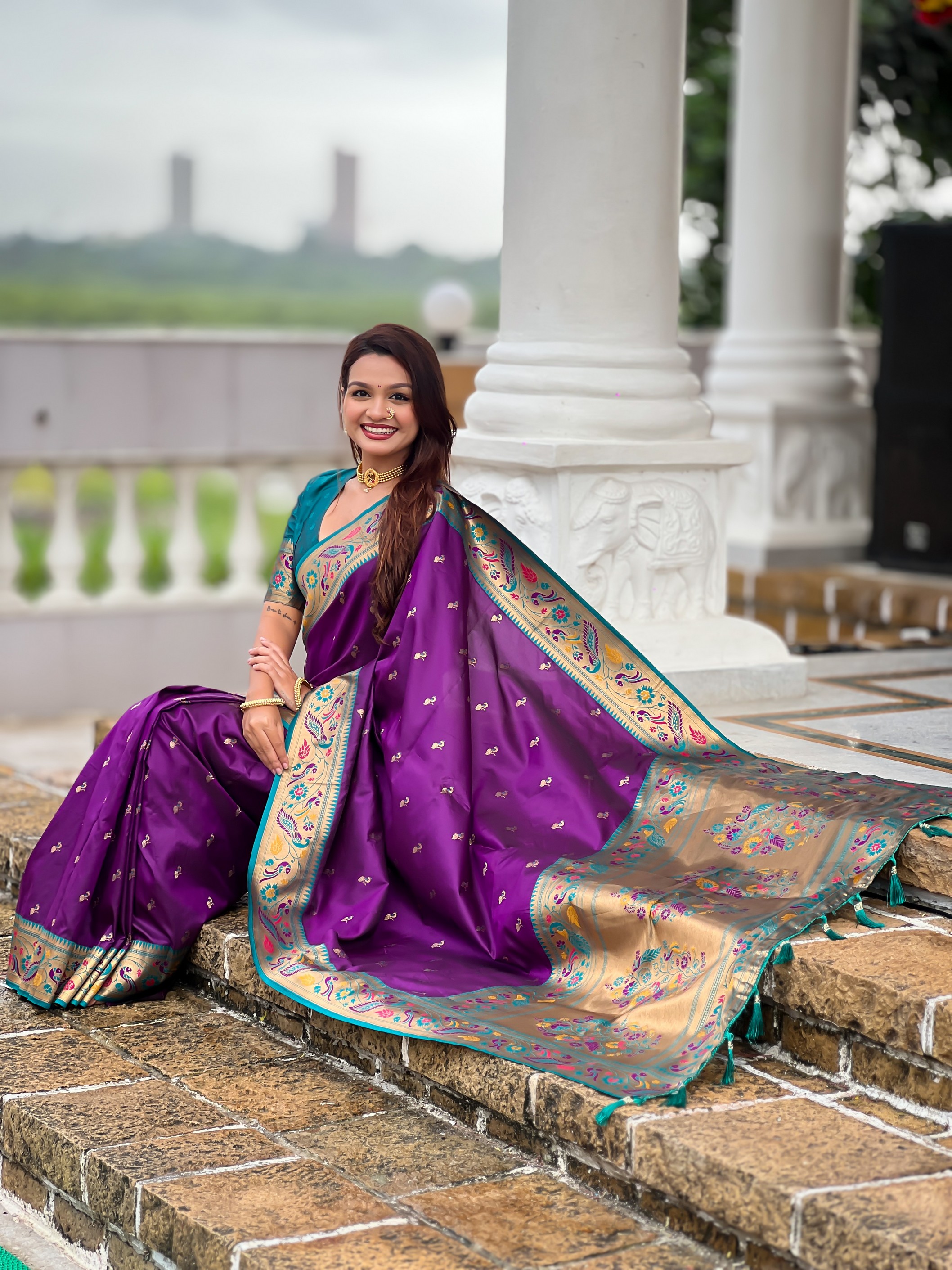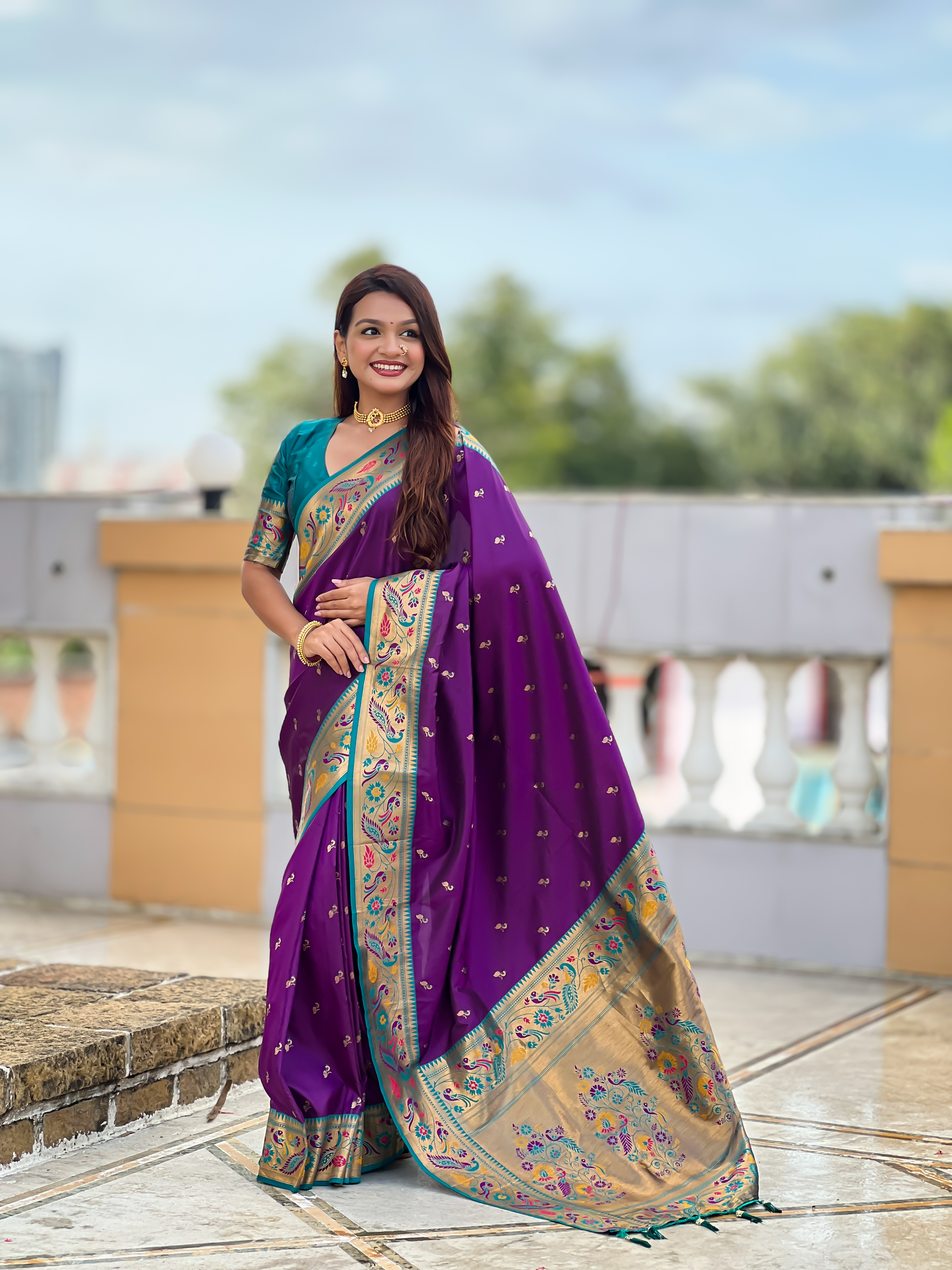 Violet Color Paithani Silk Fabric Woven Meenakari Jacquard Designer Saree