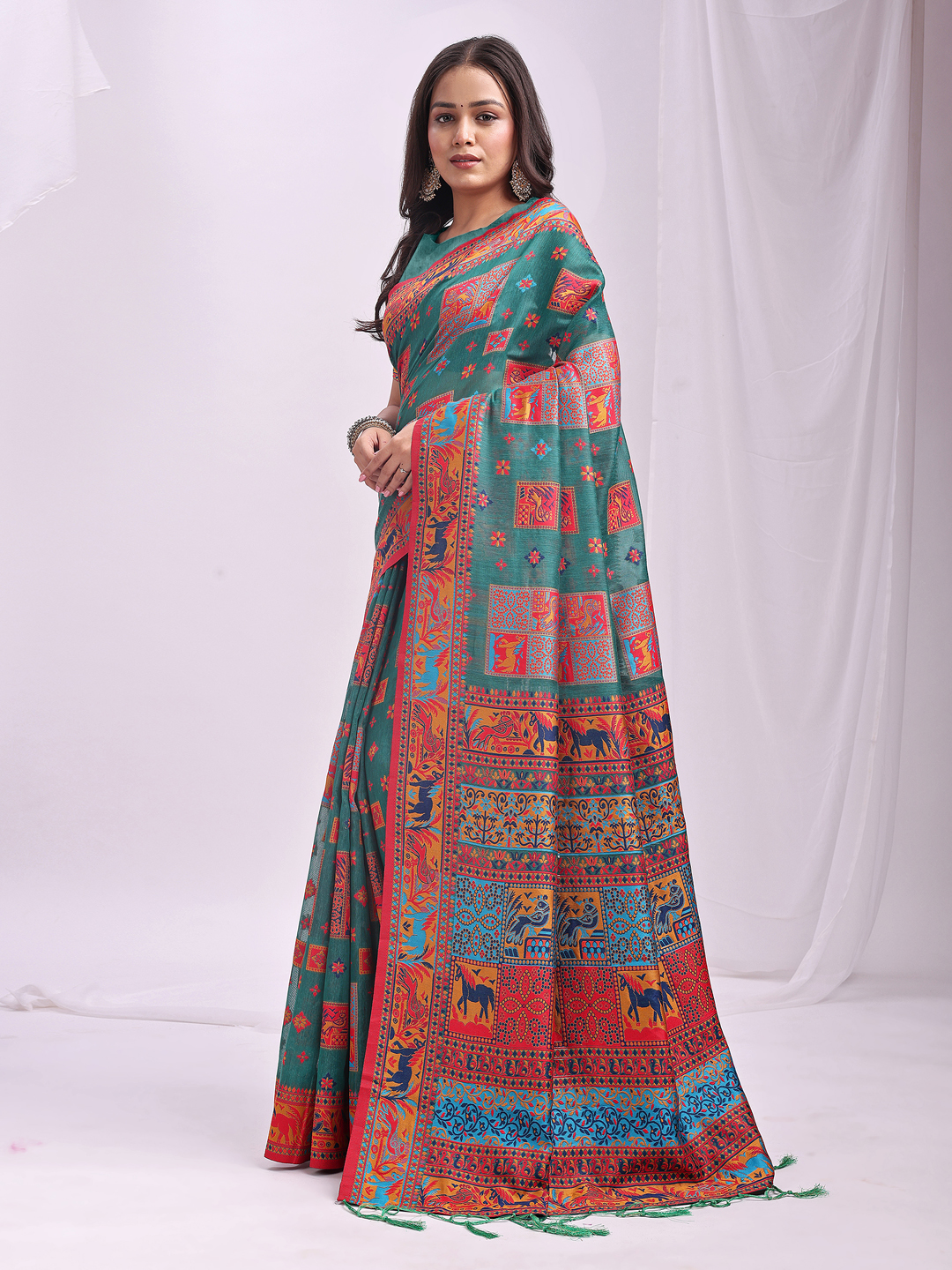 Wevon Thread Designer Rama Green Color Linen Cotton Fabric Traditional Rich Looks Saree