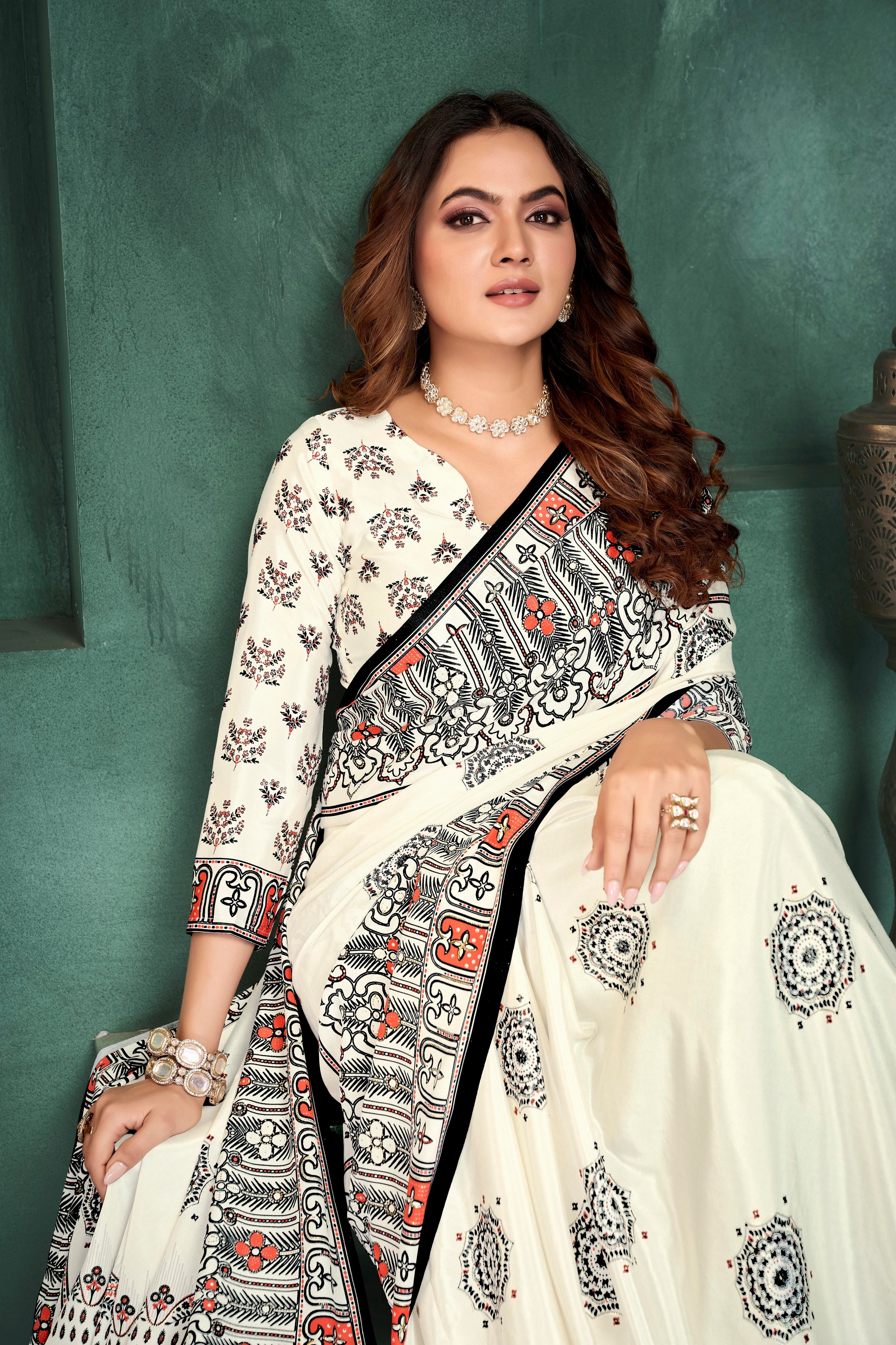 White Color Sophisticated Position Digital Foil Printed Crepe Silk Saree