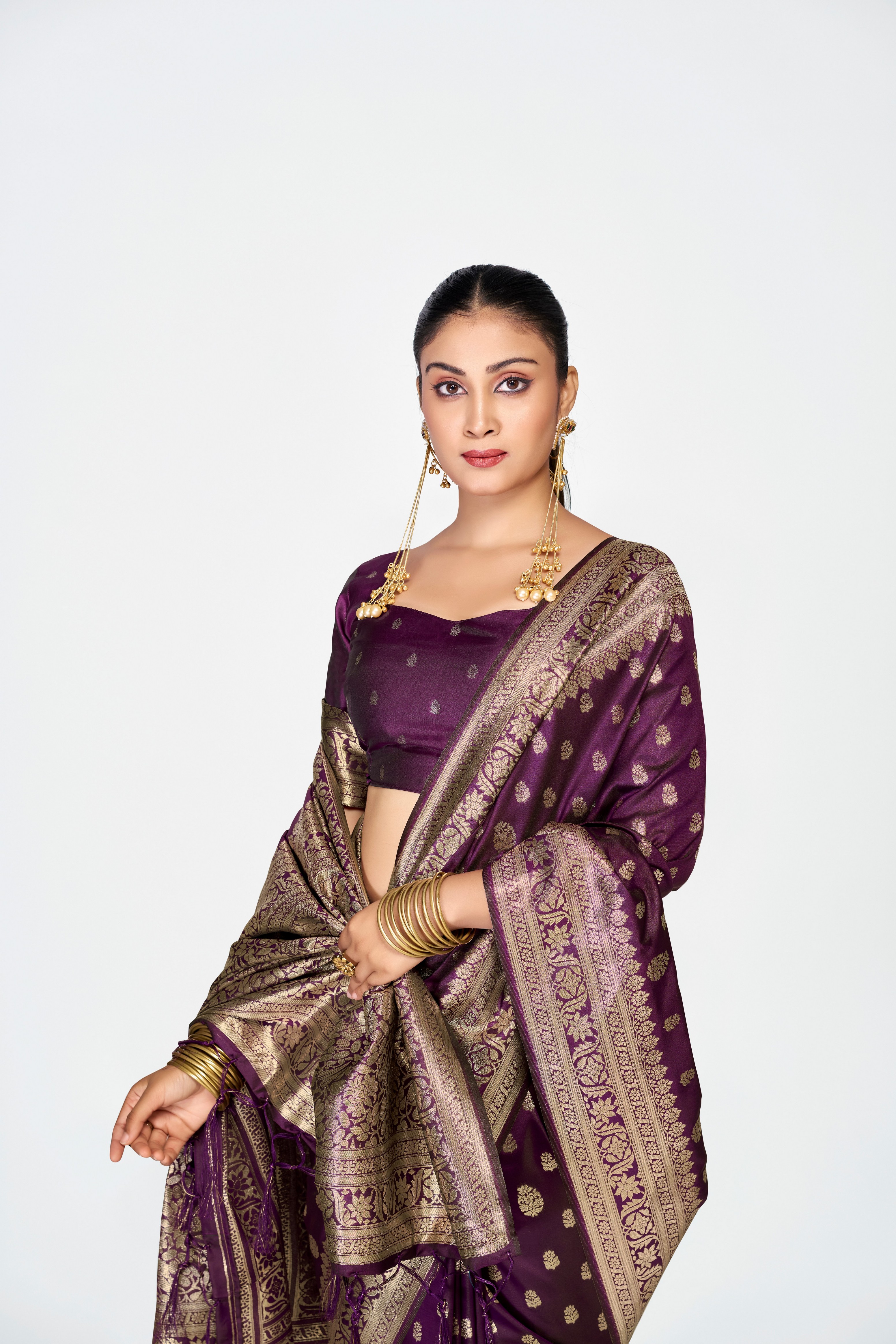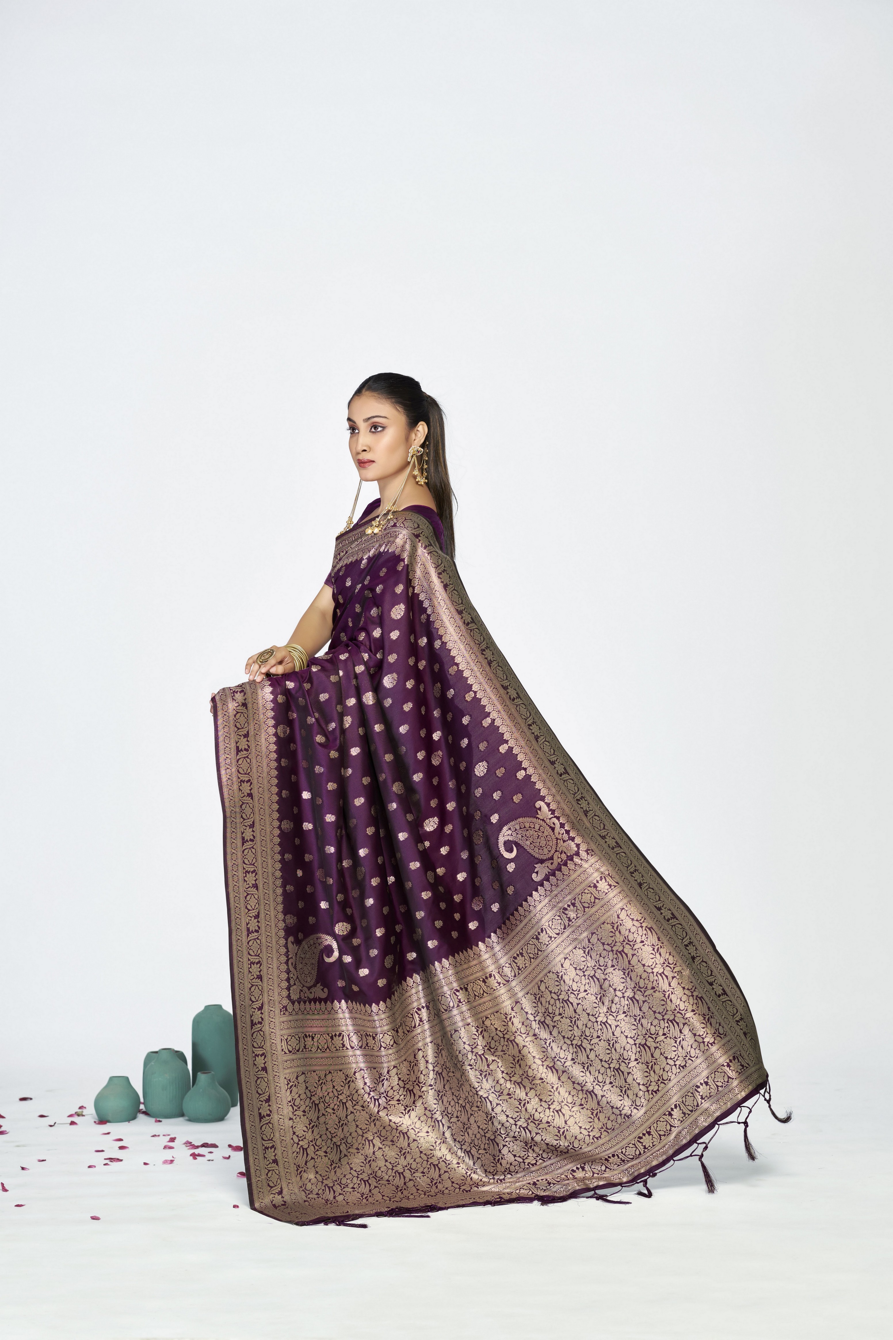 Wine Color Banarasi Silk Fabric Woven Jari Butti Designer Celebrity Fancy Saree