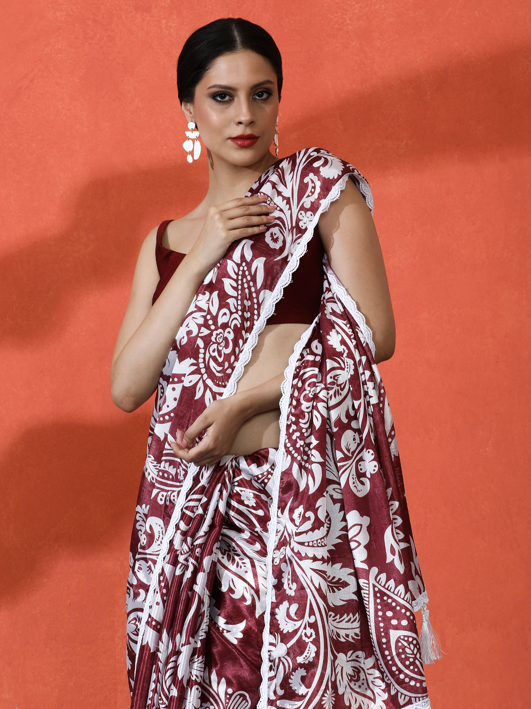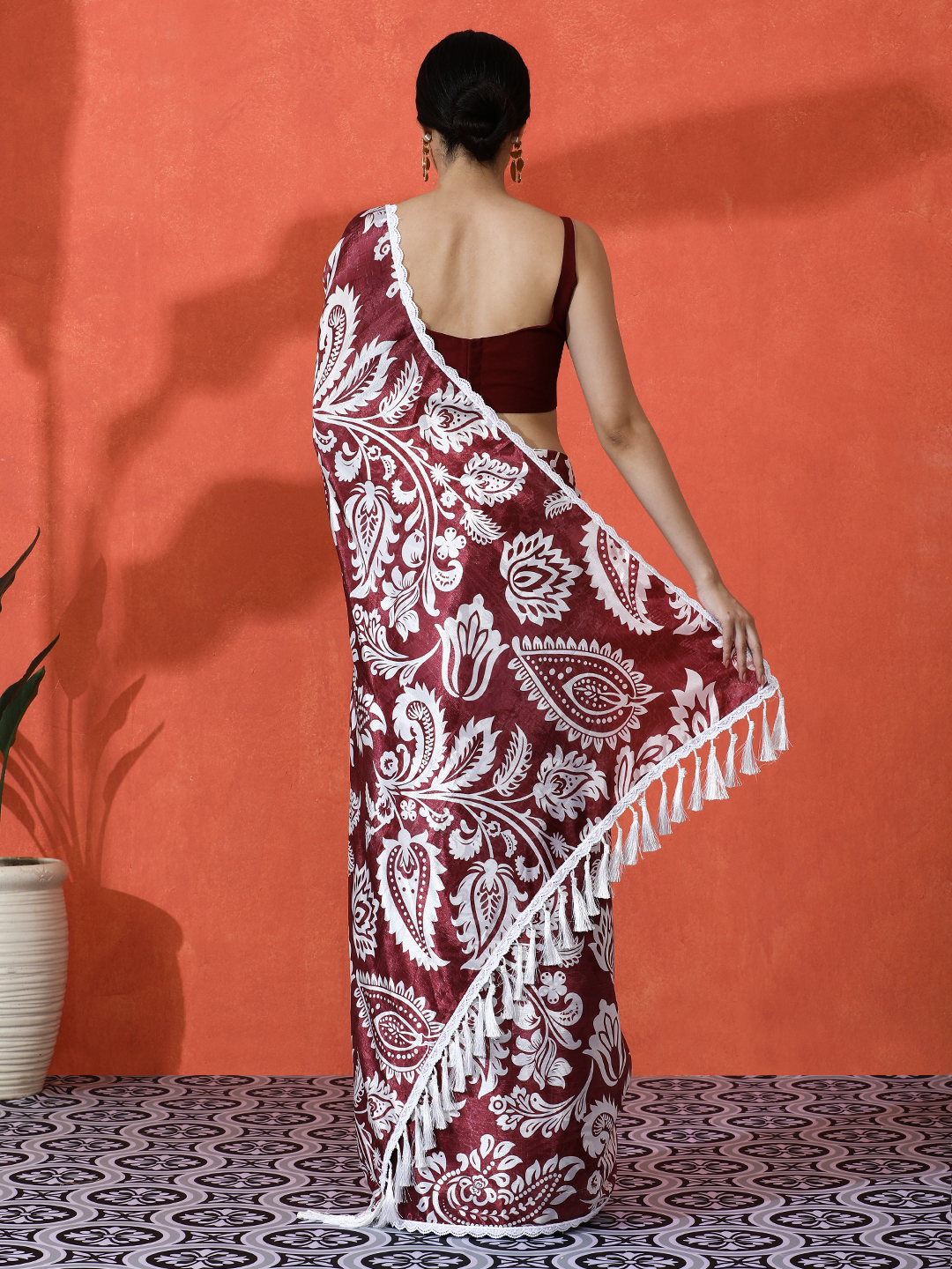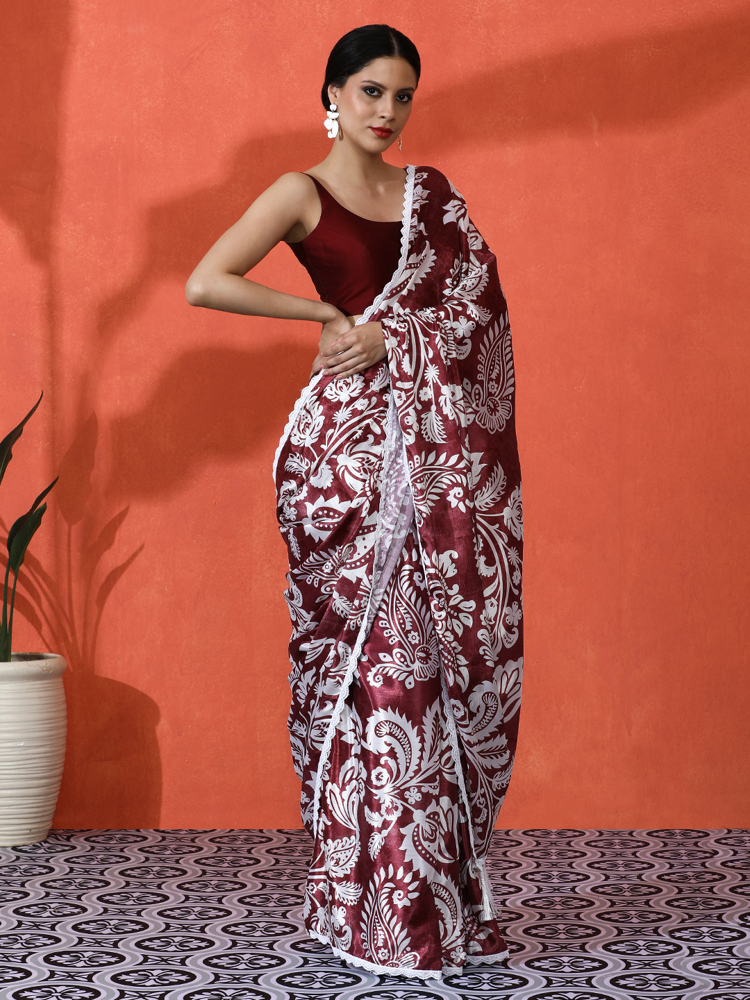 Wine Color Chinon Fabric Designer Digital Printed Saree For Ceremonial Looks