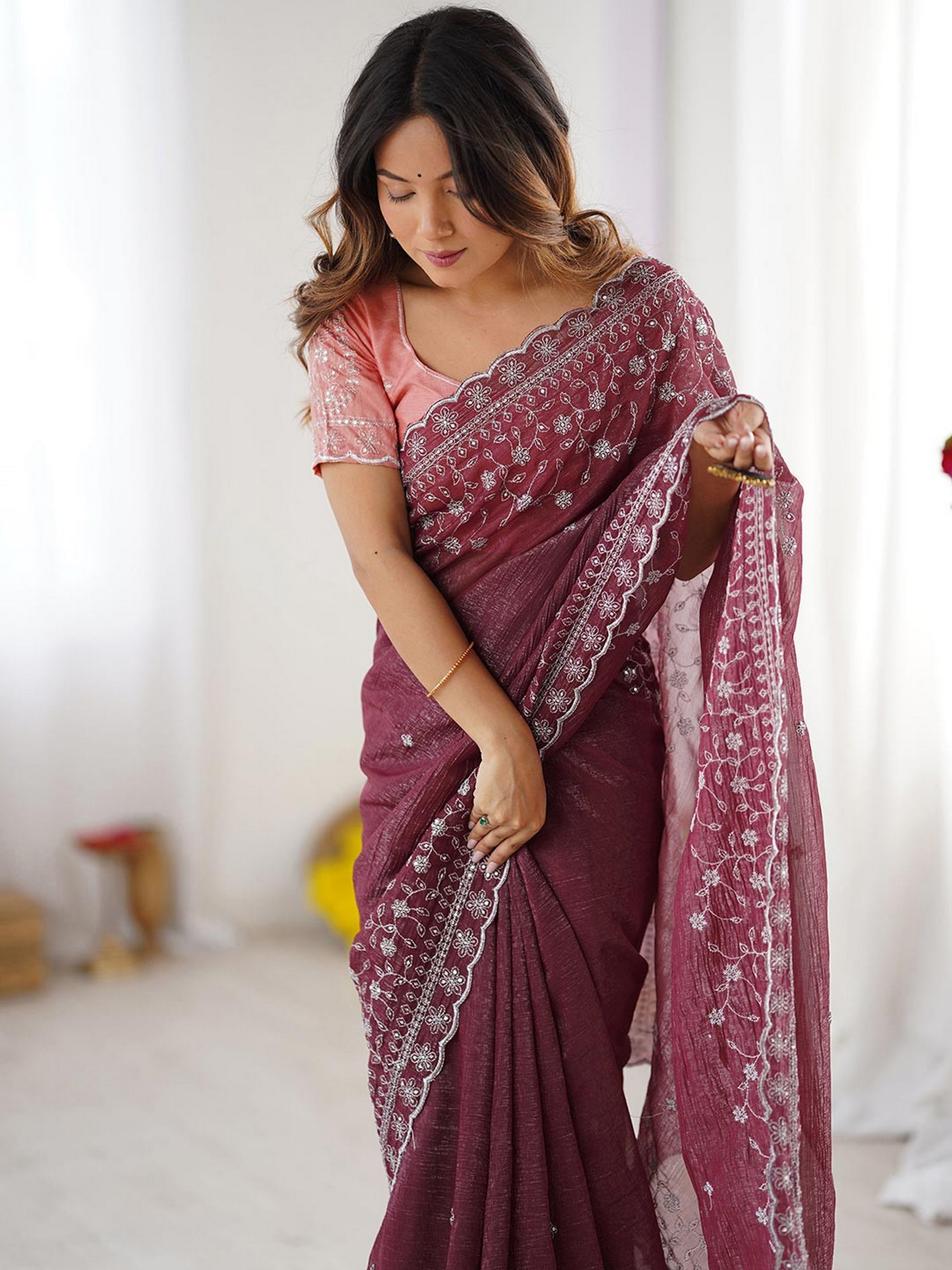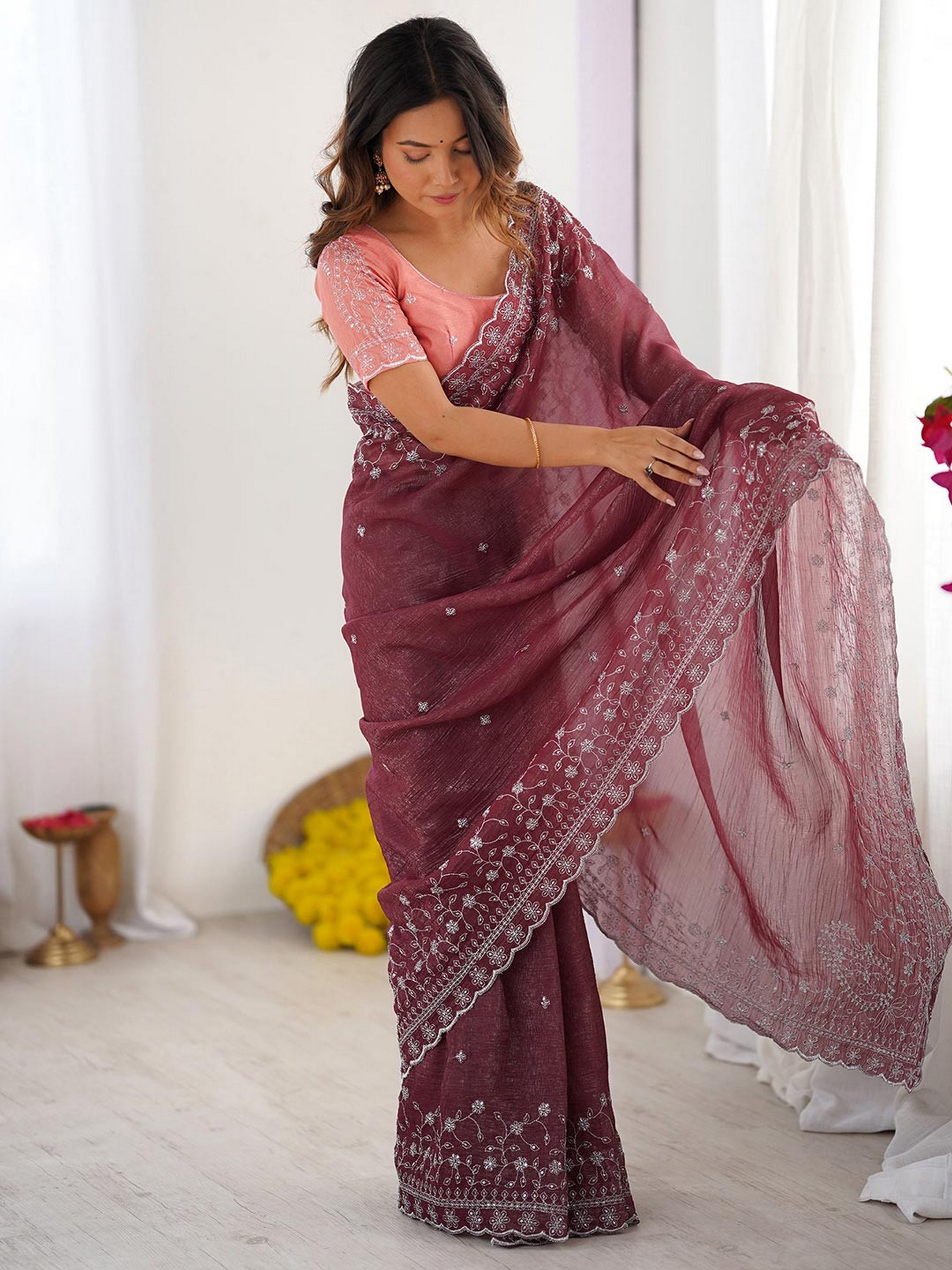 Wine Color Crunchy Silk Fabric Embroidered Partywear Saree