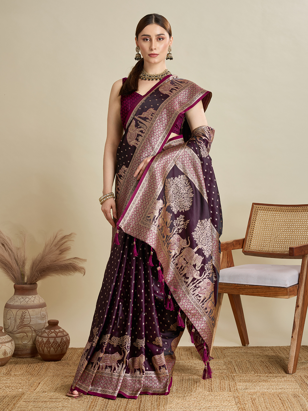 Wine Color Satin Silk Fabric Woven Designer Partywear Saree