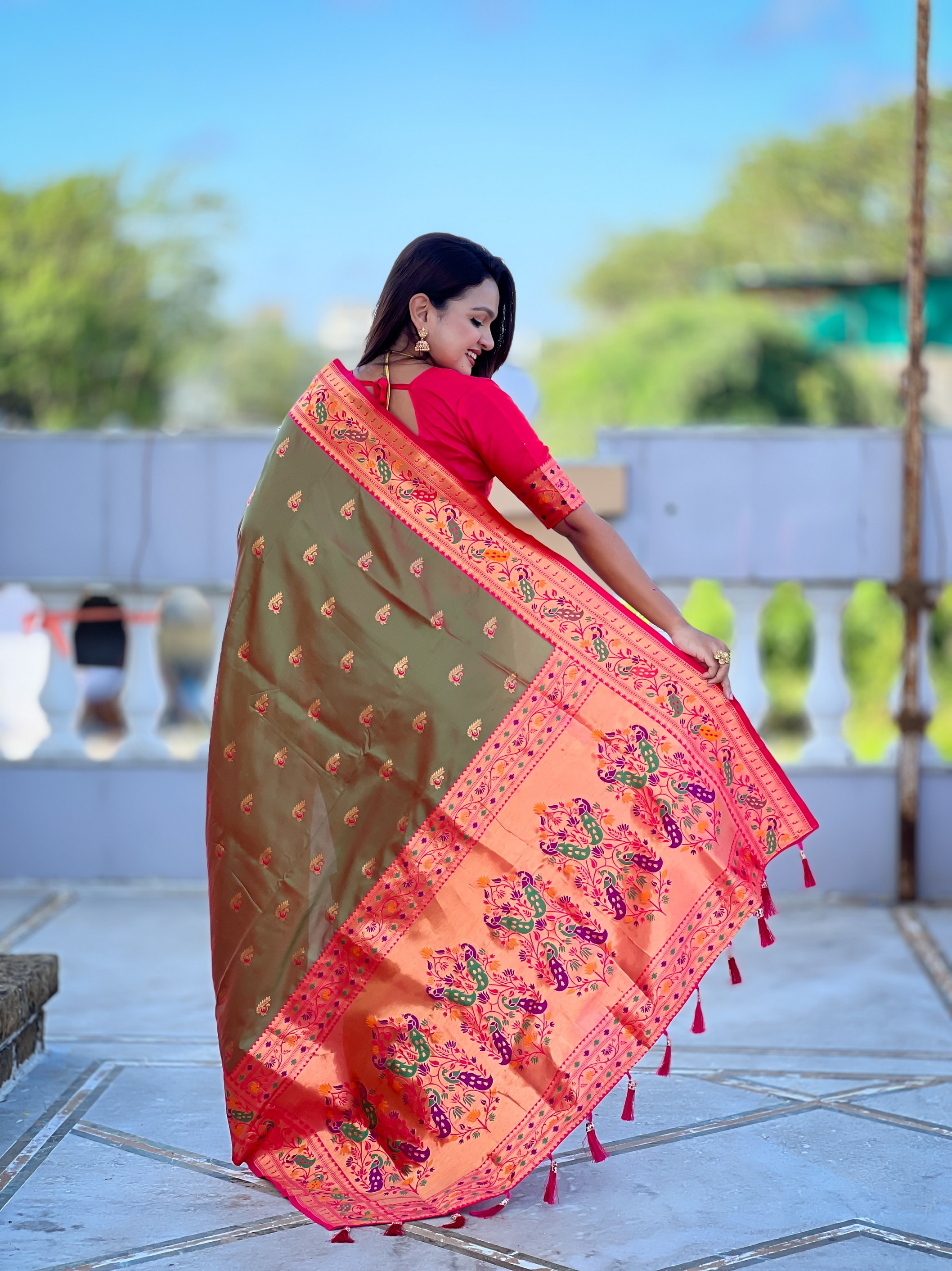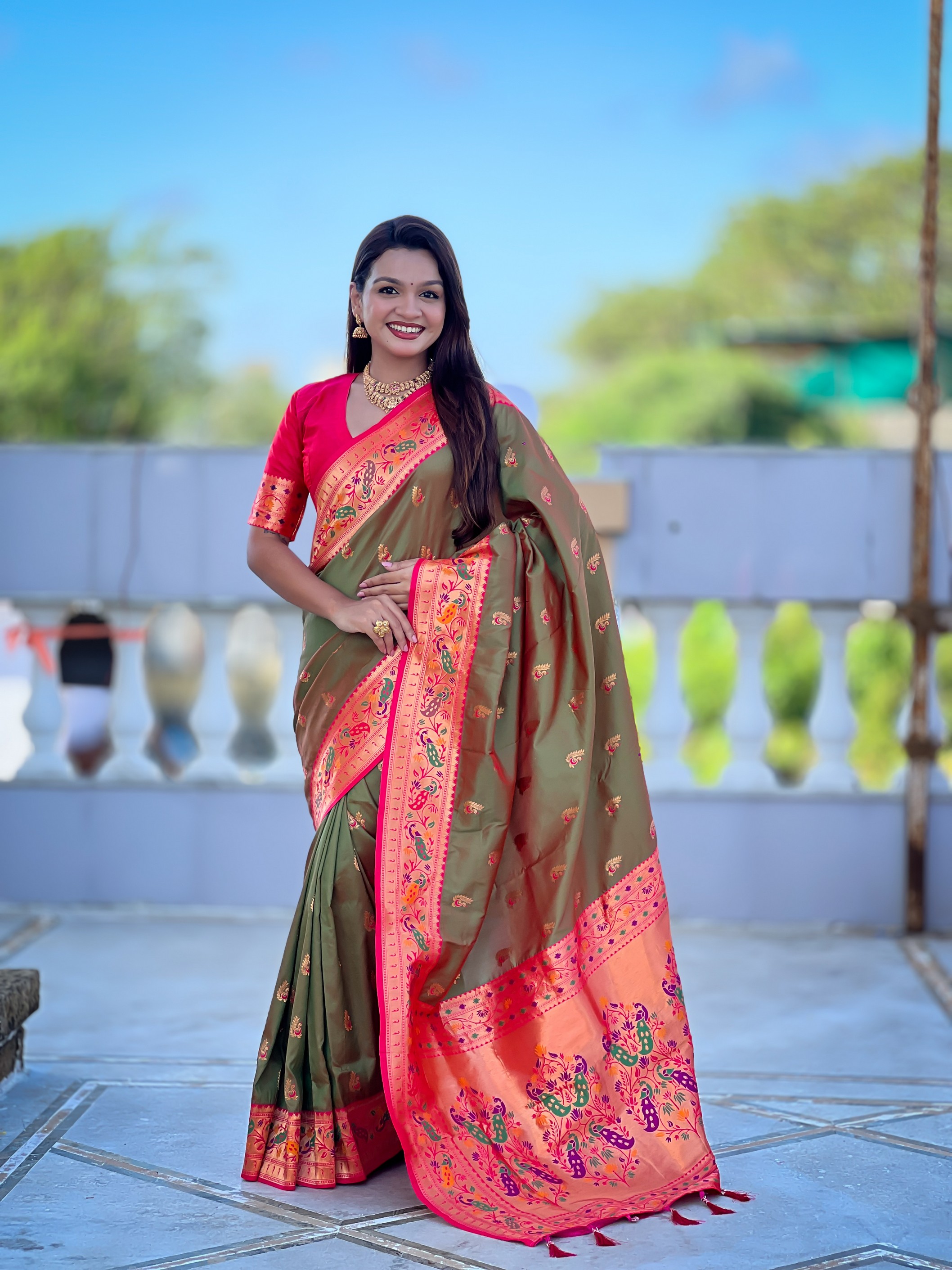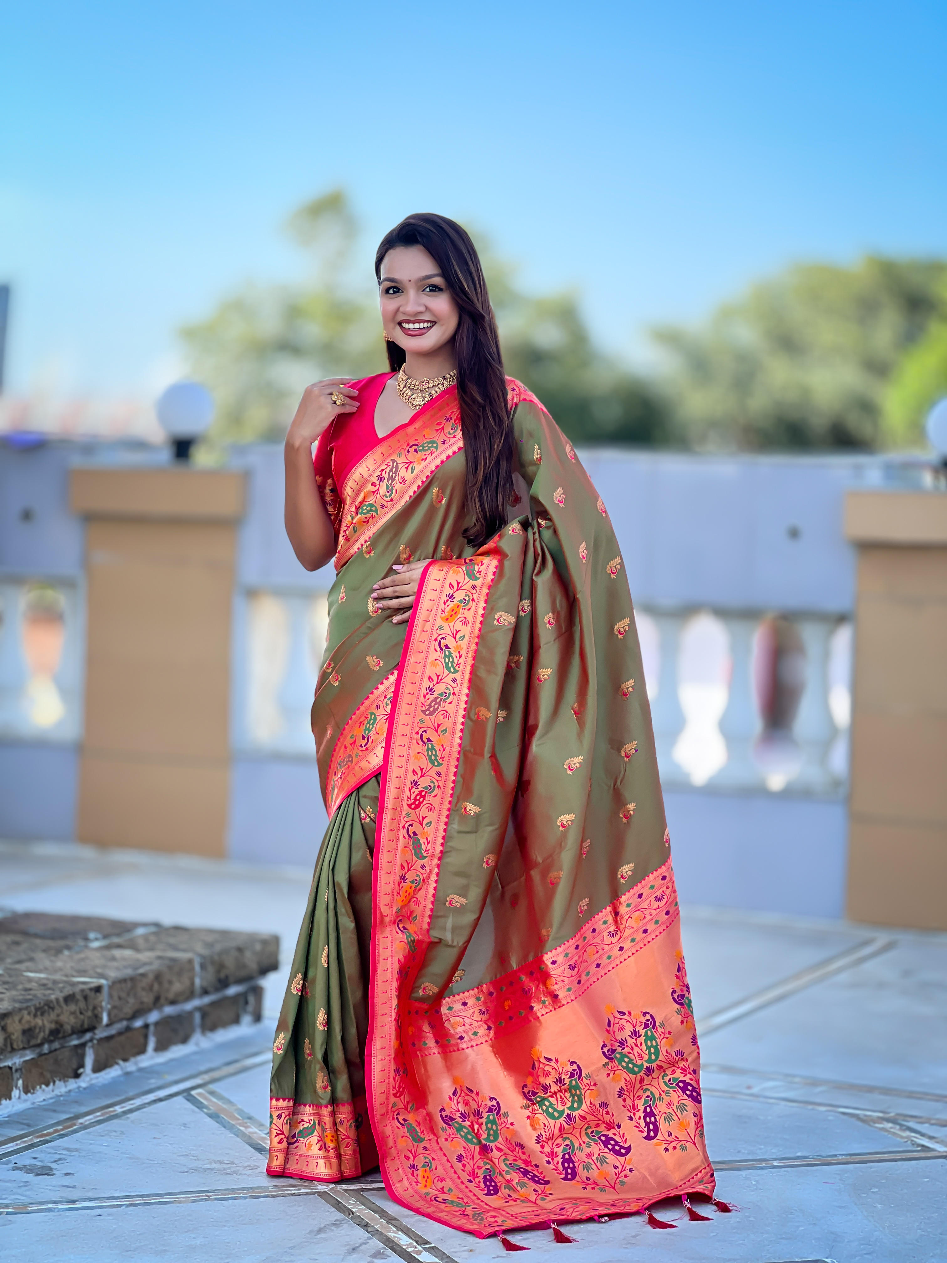 Woven Meenakari Jacquard Designer Mahendi Color Paithani Silk Saree