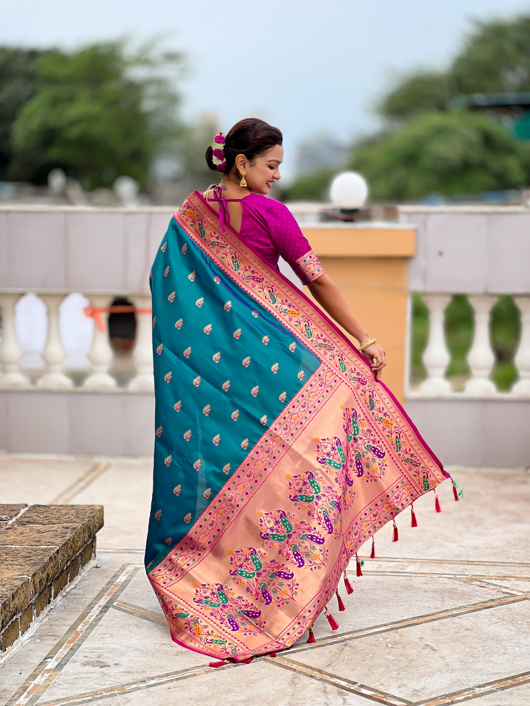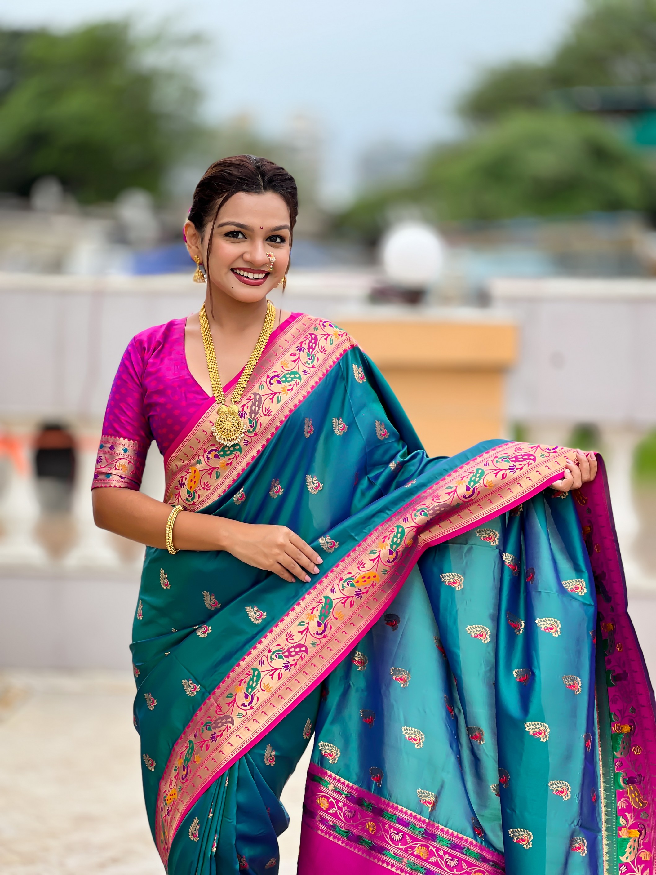 Woven Meenakari Jacquard Designer Rama Color Paithani Silk Saree