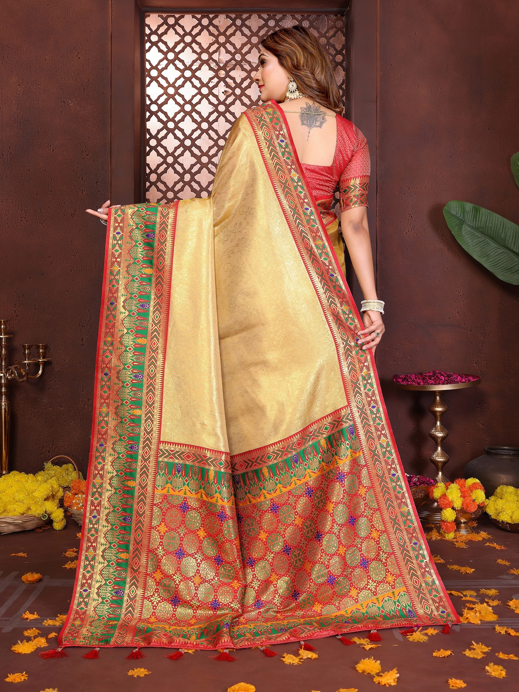 Yellow Color Banarasi Tissue Silk Fabric Woven Rich Paithani Designer Ethnic Partywear Saree