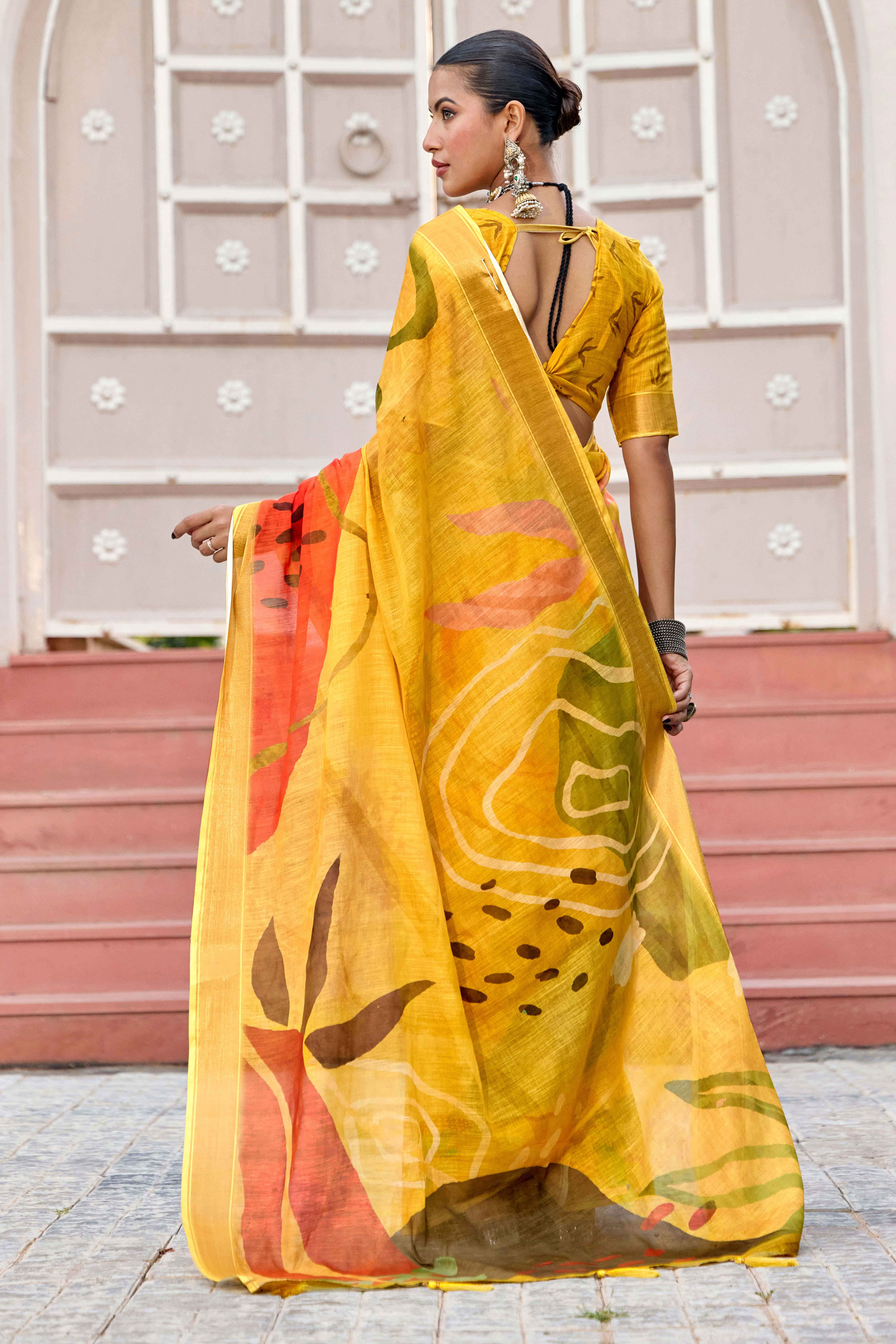 Yellow Color Beautiful Linen Silk Fabric Saree With Sophisticated Partywear Saree