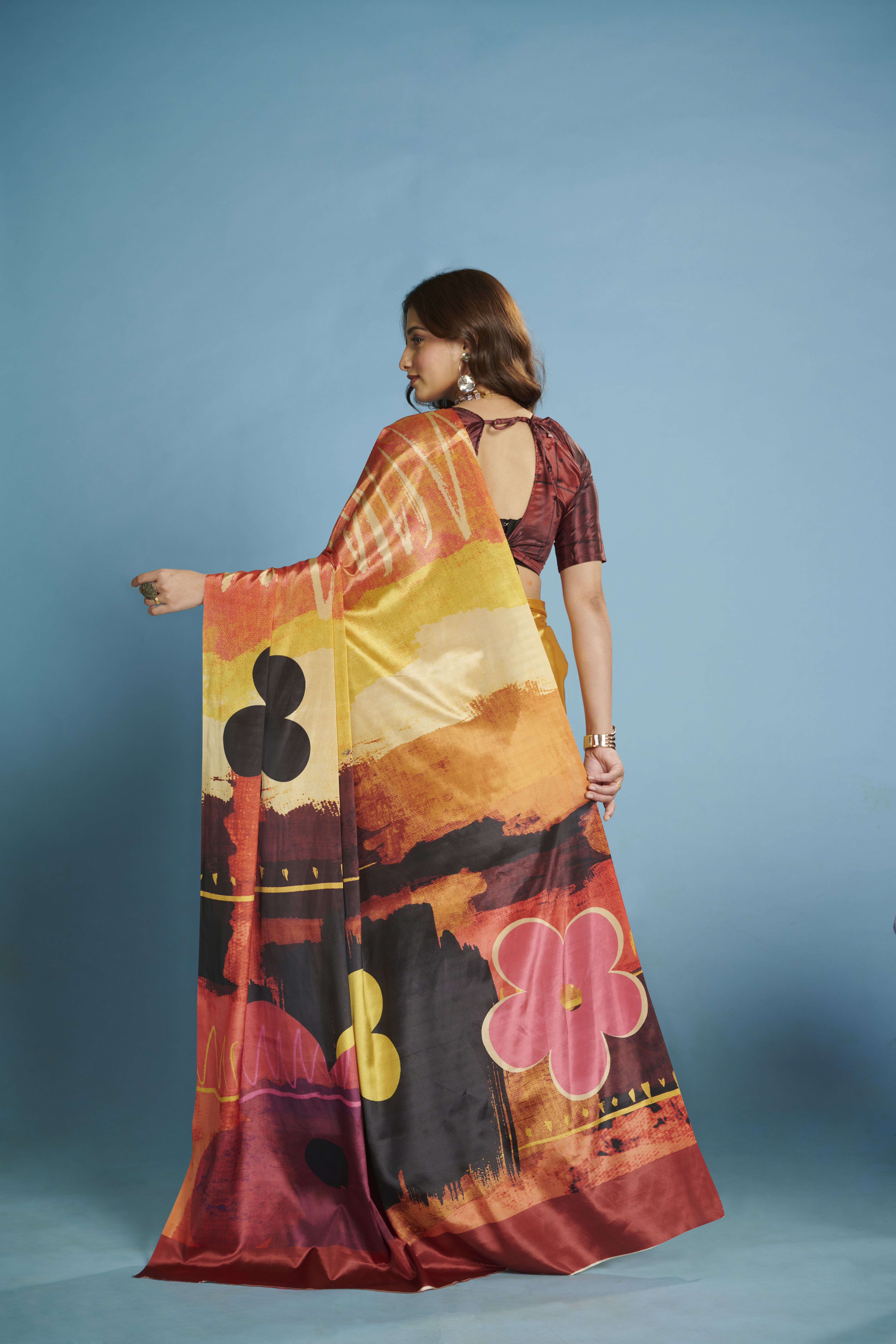 Yellow Color Malai Crepe Silk Fabric Beautiful Digital Printed Saree