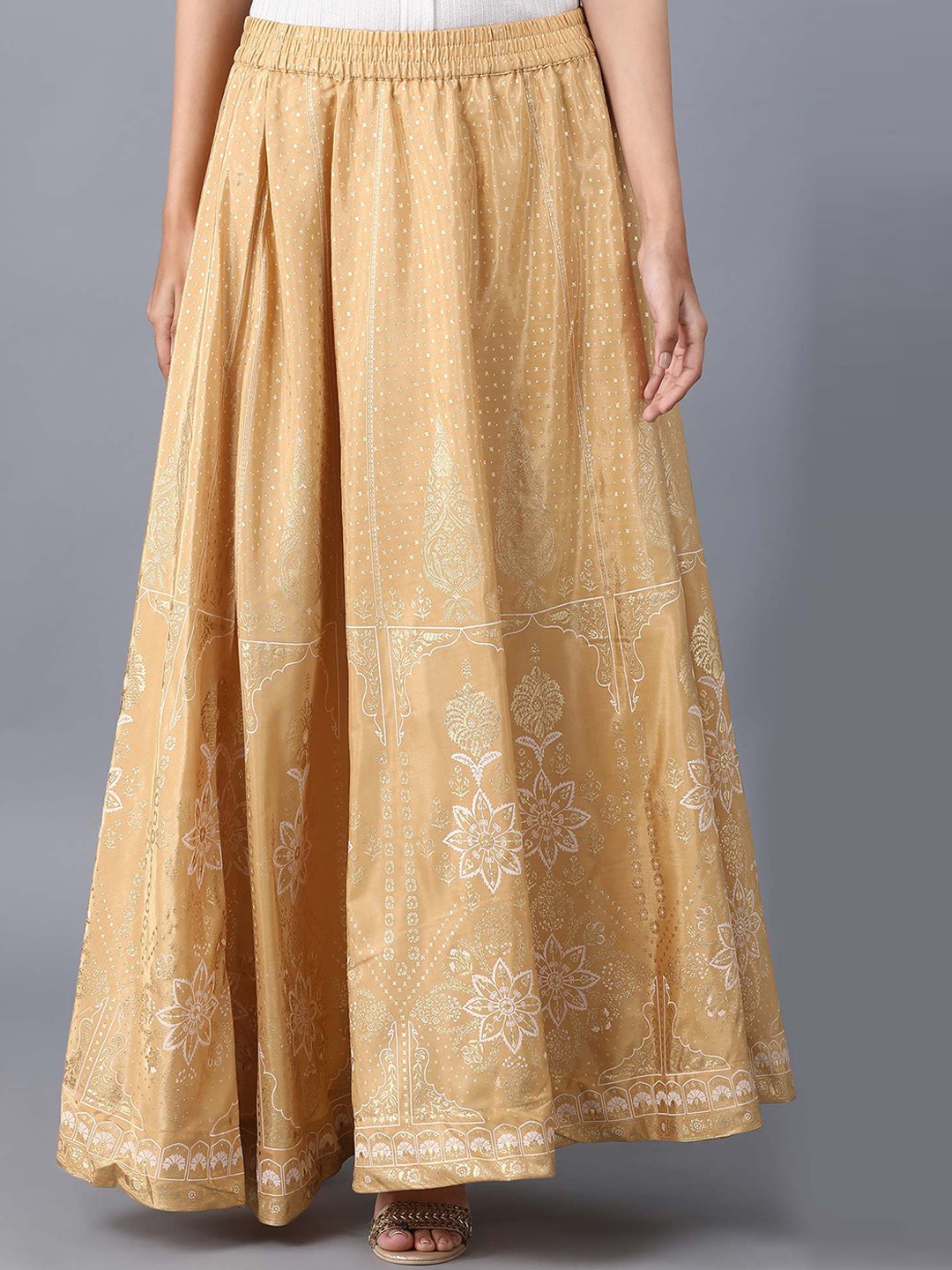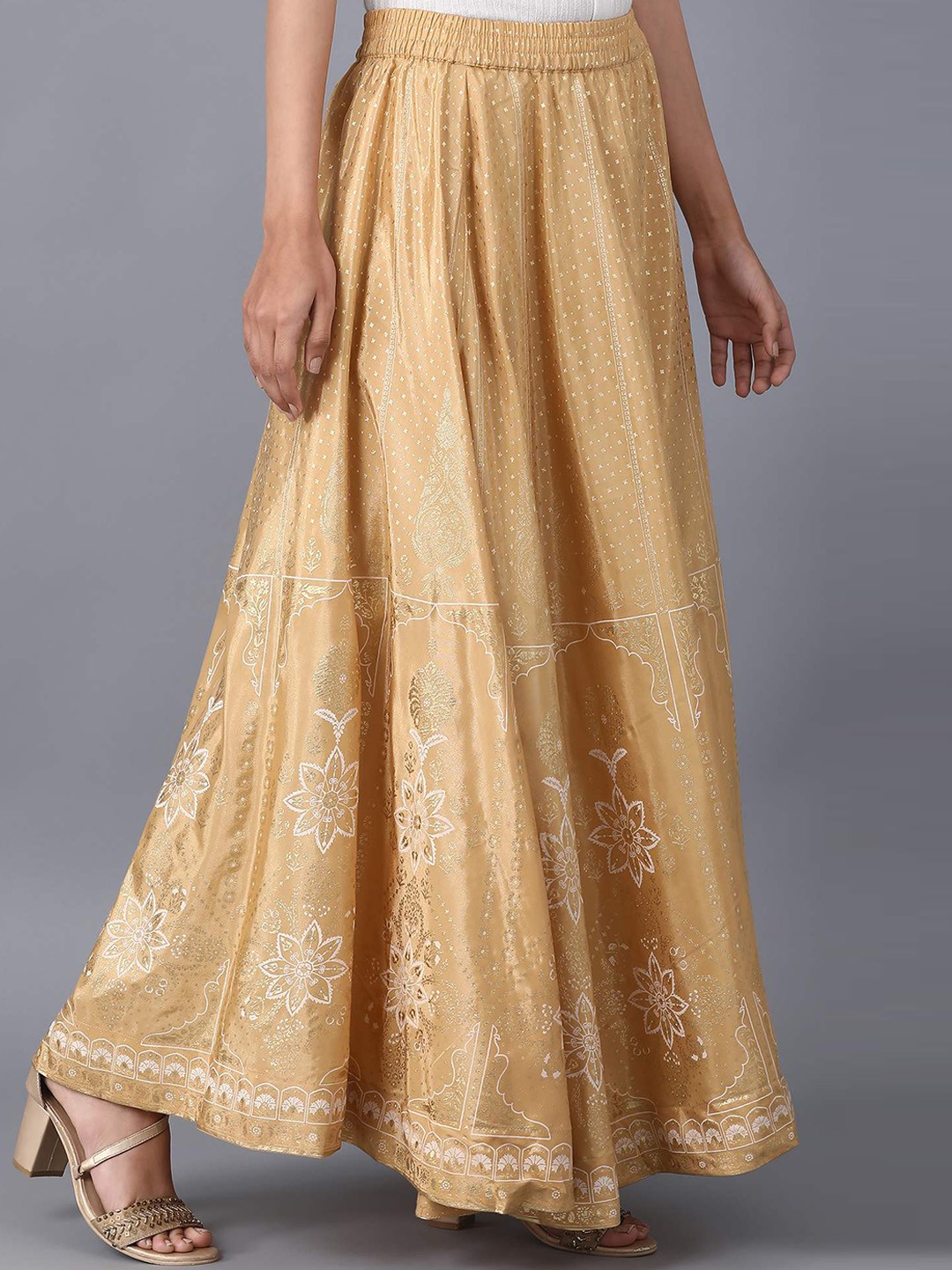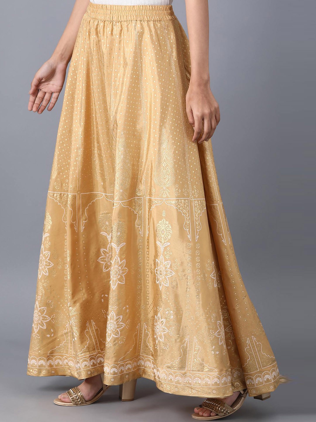 White and gold-colored floral print flared maxi skirt, has an elasticated waistband with slip-on closure and flared hem