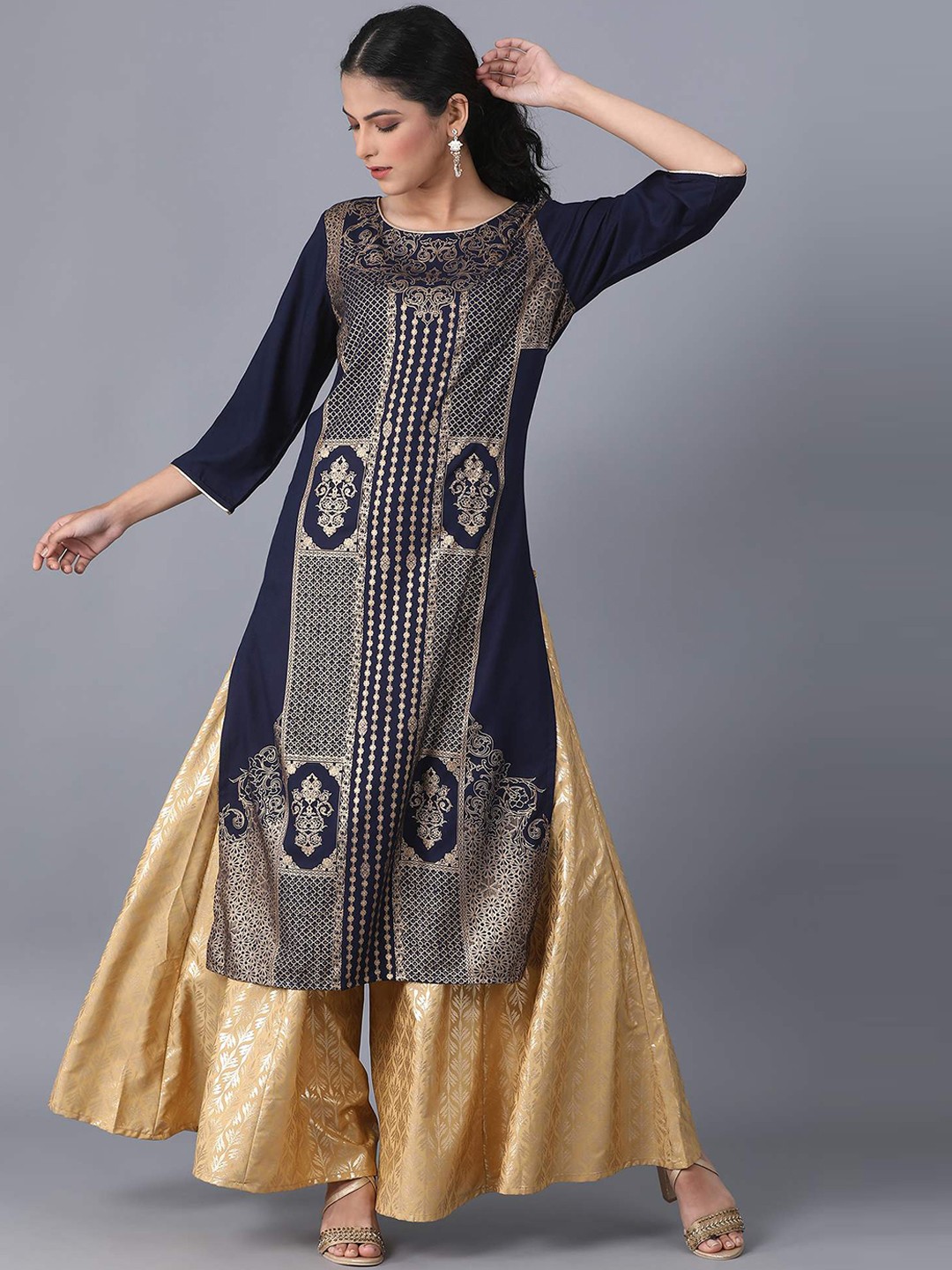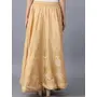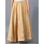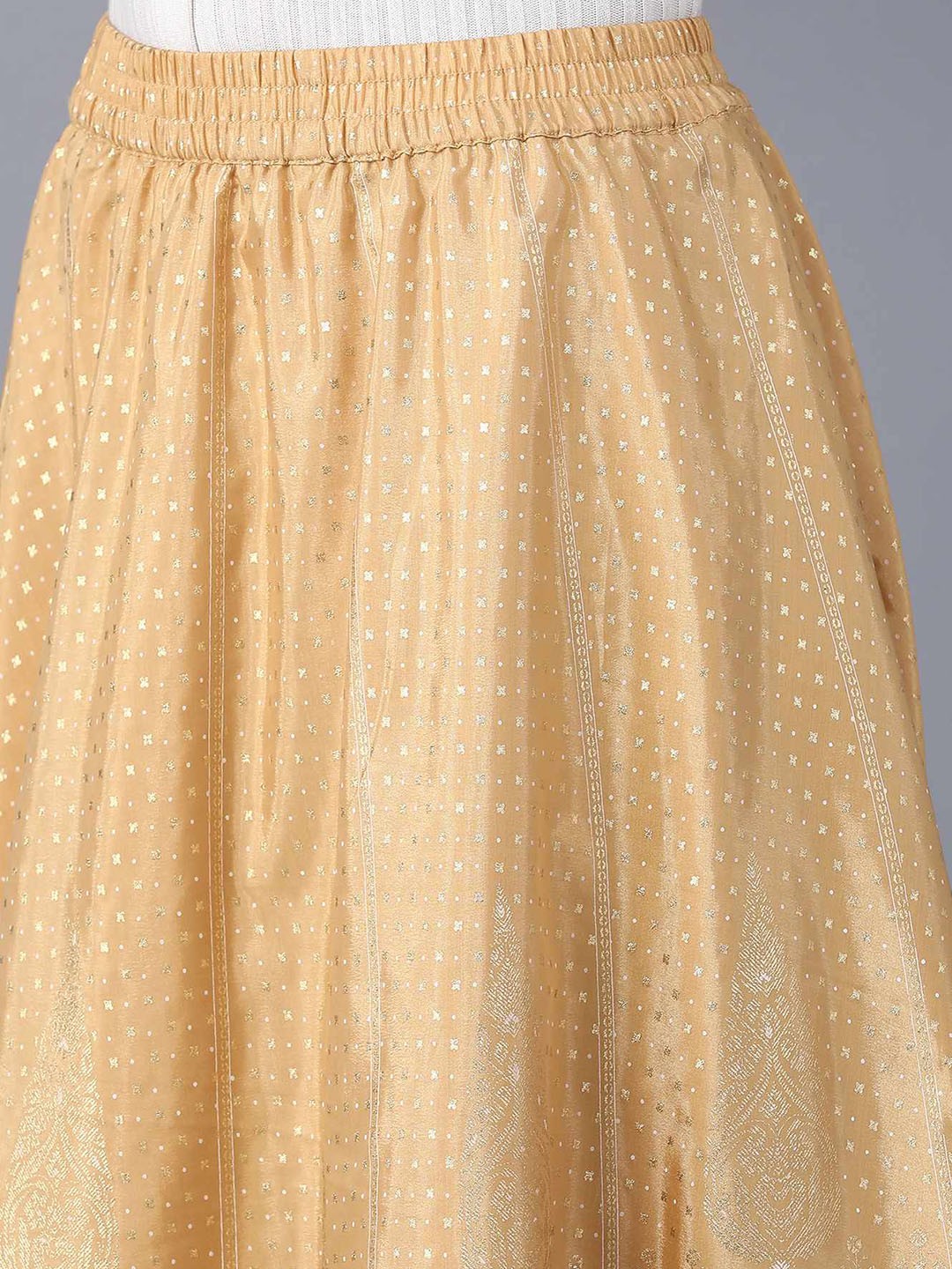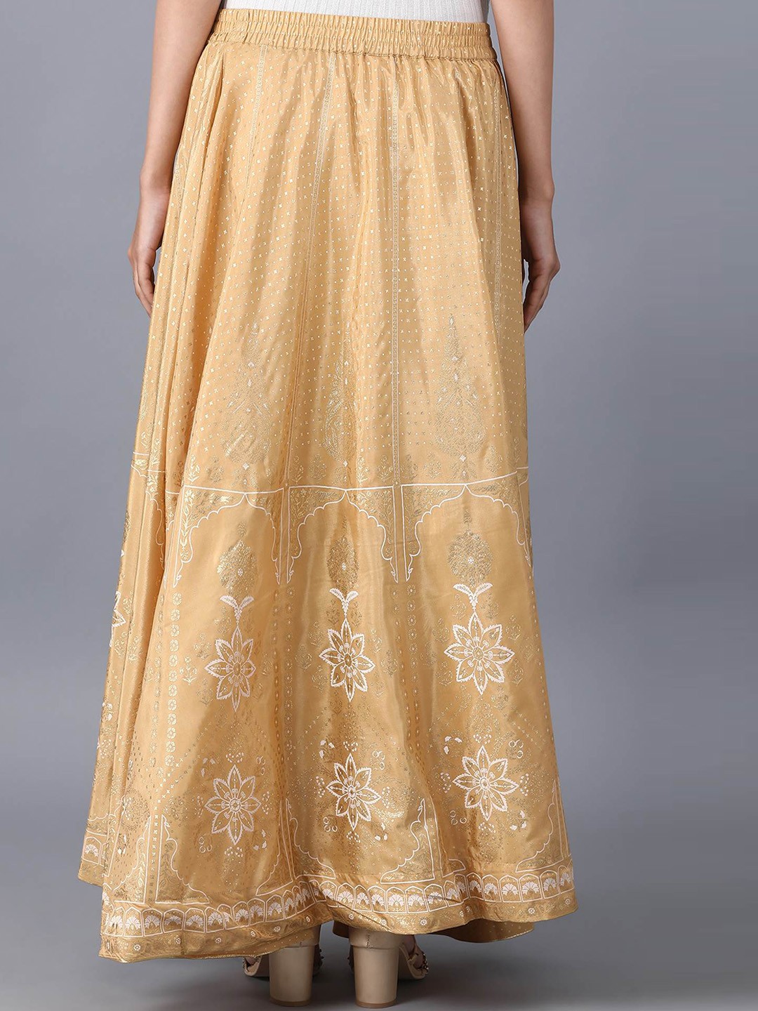 White and gold-colored floral print flared maxi skirt, has an elasticated waistband with slip-on closure and flared hem