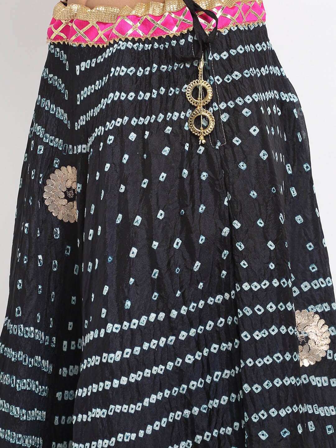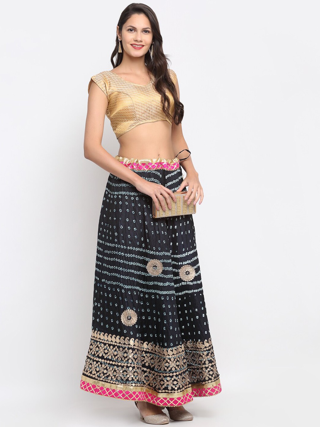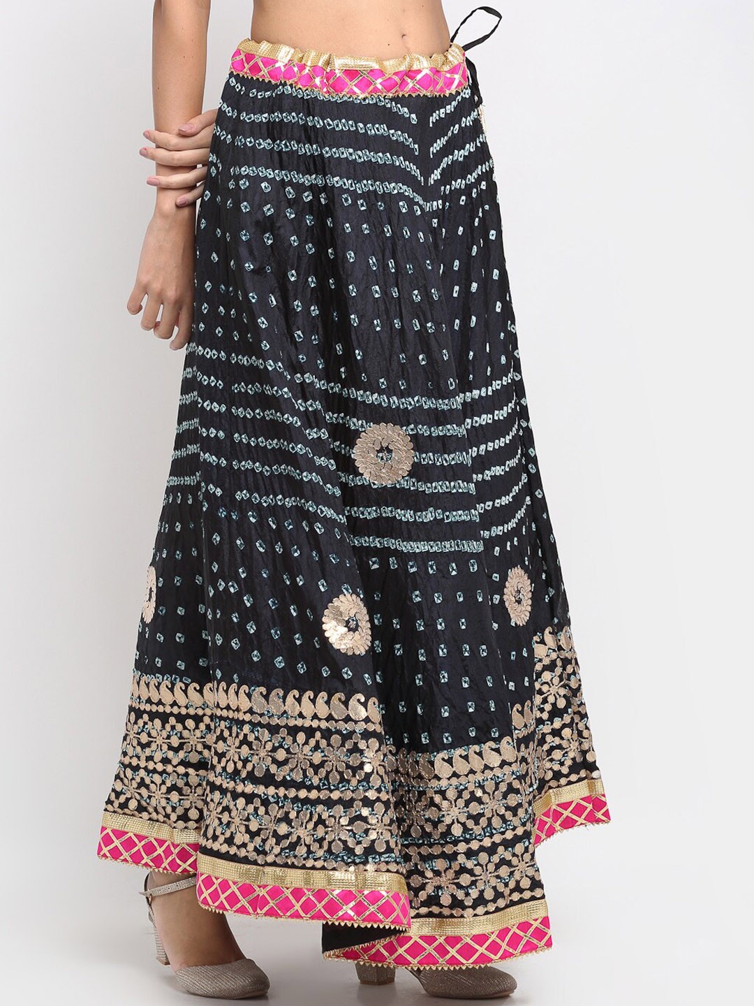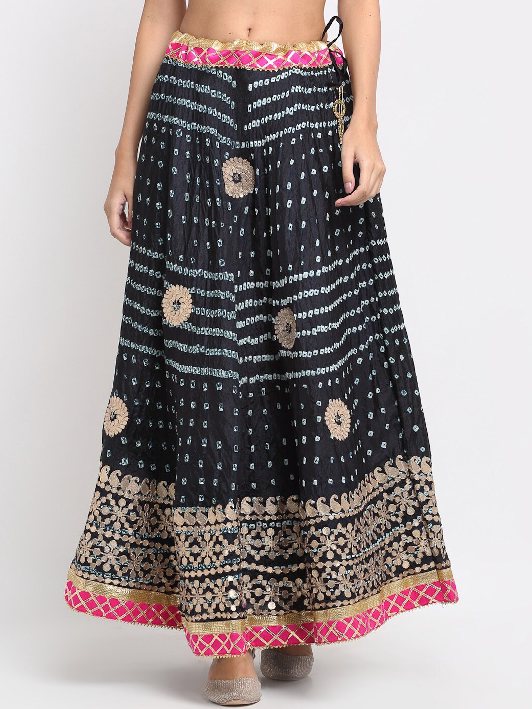 Black and gold-coloured gota patti flared maxi skirt, has an elasticated waistband with drawstring closure and flared hem