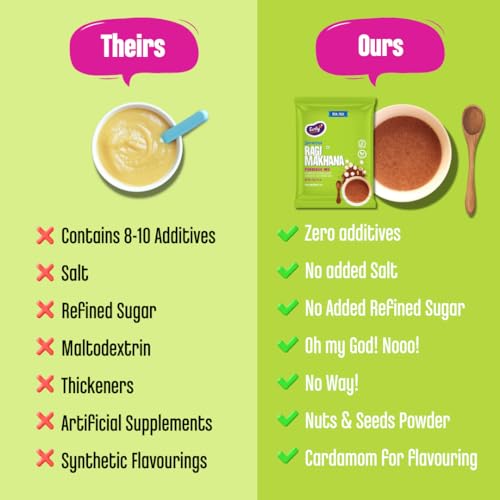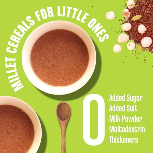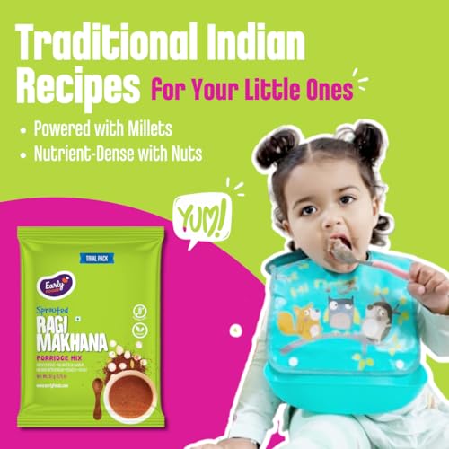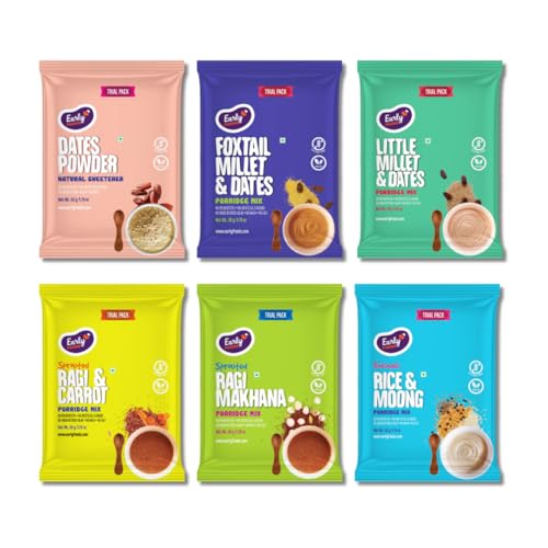 Nutrition Facts: - Handpounded white rice has more fibre minerals naturally retained compared to polished white rice. - Moong or Green Gram is a protein & dietary rich food for your little one - Ragi is a rich source of calcium and is 10x richer in calcium that wheat or rice. - Carrots are a power house of Vitamin A excellent for the eyes. Ingredients: Pack 1:Organic Ragi/ Naachni Cardamom Pack 2:Organic Handpounded white rice (56%) Split Moong Dal / Lentils (43%) Pepper Jeera Ajwain Pack 3: Organic Sprouted Ragi/Finger Millet Sundried Powdered Carrot Dates Almonds Lotus Seeds/Makhana Cardamom Pack 4: Dates Powder No added sugar or salt or milk powder. No preservatives colours or artificial flavours. Shelf Life: Best before 4 months from MFD. Best to store in a dry steel or glass container in a refrigerator. Why Moms Love Early Foods? - Made from ancient Indian Super Foods - We make really small batches of food each day. So you can always feed super fresh meals. - Grandma inspired recipes simple healthy with minimal processing - No Sugar or salt or milk powder. - No Preservatives colours or artificial flavours. All Natural