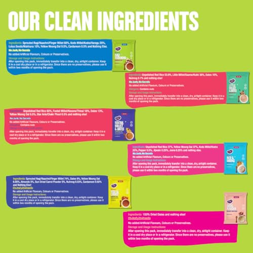 Pack 3:Organic Sprouted Ragi/Finger Millet Sundried Powdered Carrot Dates Almonds Lotus Seeds/Makhana Cardamom and Nothing Else. Pack 2:Organic Ragi/ Naachni (85%) Split Moong Dal / Lentils (15%) and Nothing Else Pack 1:Organic Handpounded White Rice (56%