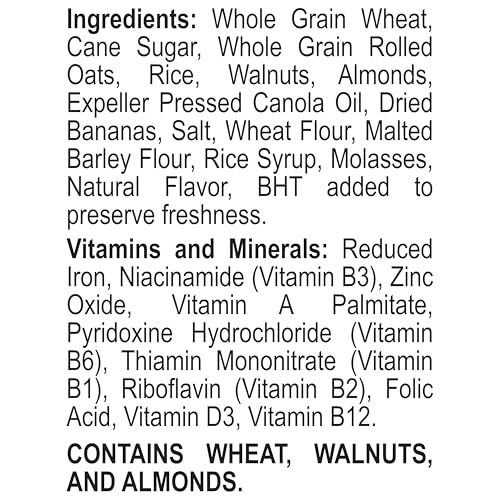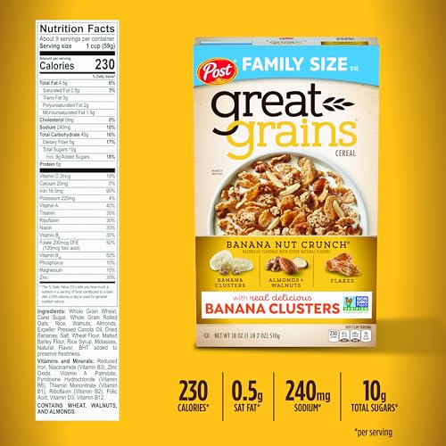 Post Great Grains banana nut crunch cereal has all the flavour of banana nut bread packed into a cereal bowl. It features crunchy clusters and real bananas that provide a sweet flavour making it an ideal option for starting your the morning or enjoying throughout the day. Post Great Grains cereal is made with real almonds and walnuts partnered with crispy flakes to offer a unique blend that pairs well with milk. It can also be enjoyed dry as a quick and crunchy snack. This breakfast cereal can be added to baked goods and desserts as a flavour-bursting topper as well. Add your favourite fruits for a satisfying mix that the whole family will enjoy.