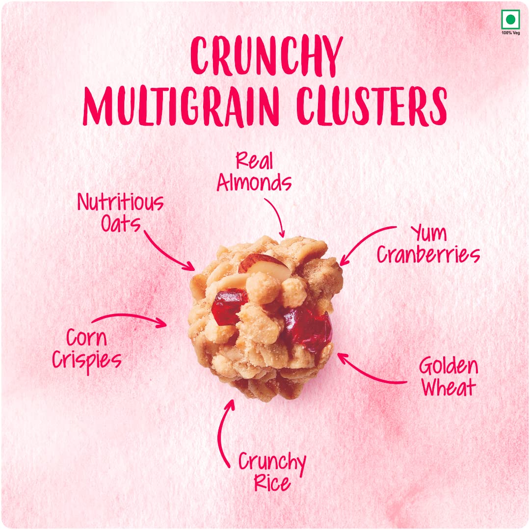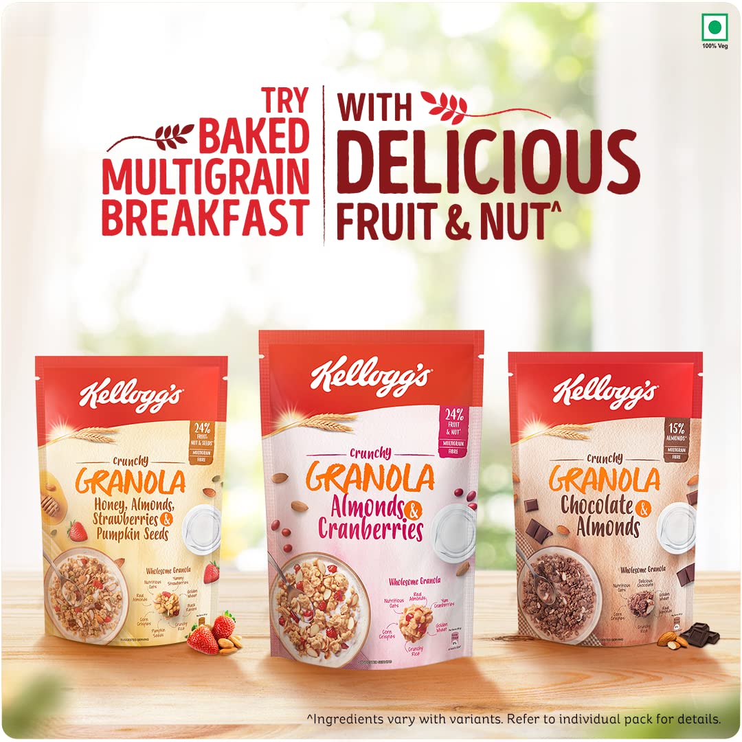 New Kellogg's Crunchy Granola is an irresistibly tastye way to start your day. Enjoy baked multigrain clusters of whole-grain oats wheat corn rice and barley generously loaded with real almonds and cranberries. Have it with milk or as is for a tasty nourishing start to your day!