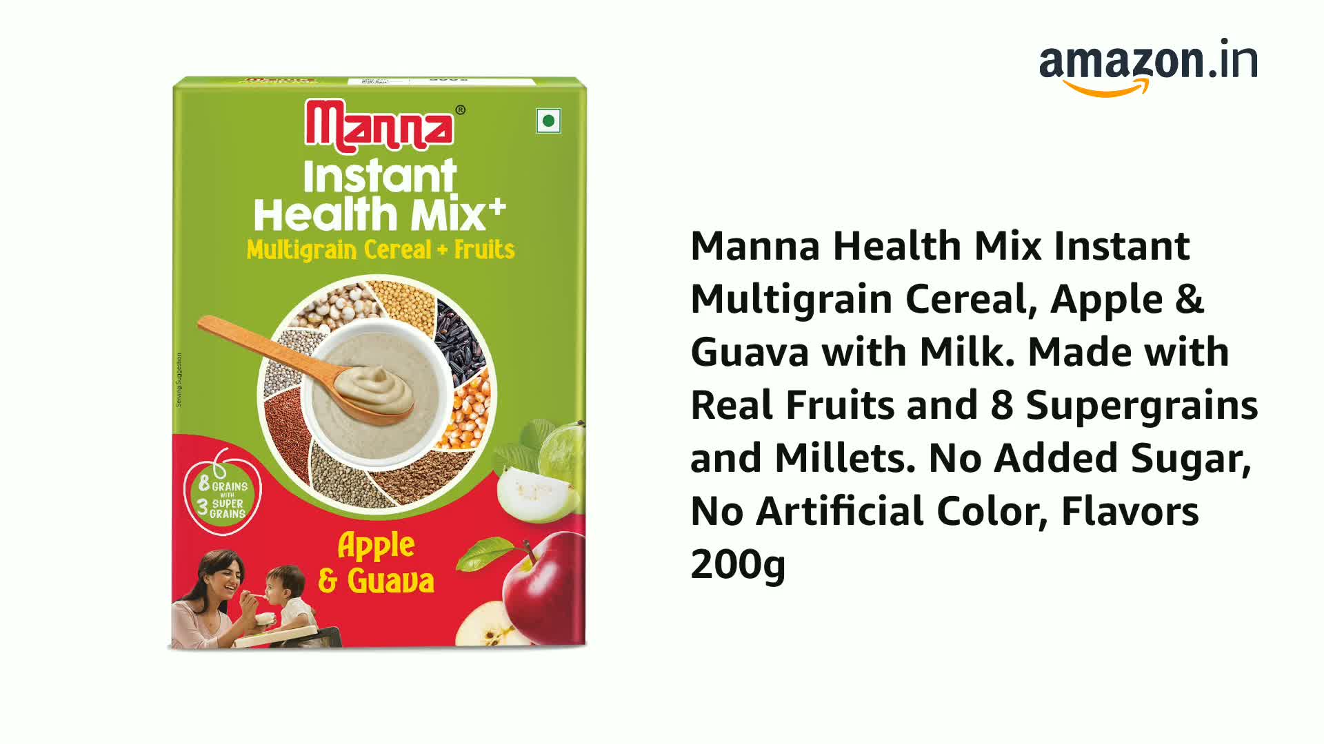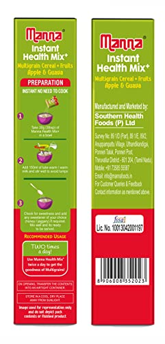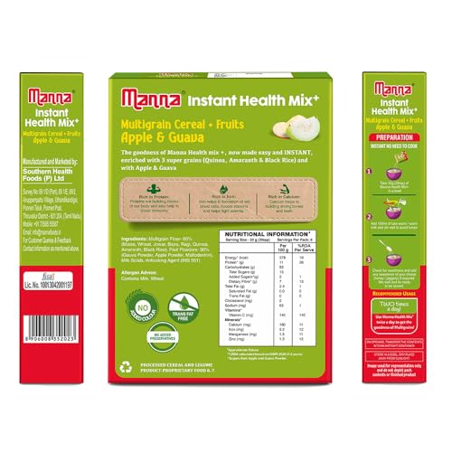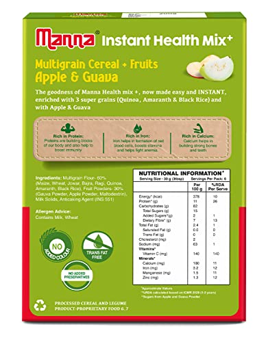 HomeGroceryHealthy BreakfastCereals & PorridgeManna Health Mix Instant Multigrain Cereal, Apple & Guava with Milk. Made with Real Fruits and 8 Supergrains and Millets. No Added Sugar, No Artificial Color, Flavors 200g