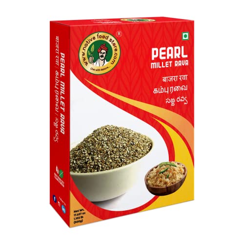 Pearl Millet Rava is pearl millet semolina for making a delicious breakfast. Also known as Bajra it is super healthy and packed with valuable nutrients to start the day off right. Pearl Millet (Pennisetumglaucum) is one of the oldest millet used by our ancestors and is one of the most important cereal grown in tropical semi arid regions of the world primarily Asia and Africa. It is known to have a very high fibre. Pearl Millet Rava is also ideal for making Pearl Rava Upma Rava Kichadi Rava Payasam Rava Pongal Rava Halwa Rava Idli Rava Appam etc. Native Food produces all its products exclusively with natural ingredients without preservatives without added colours and without flavour. Taste the difference.