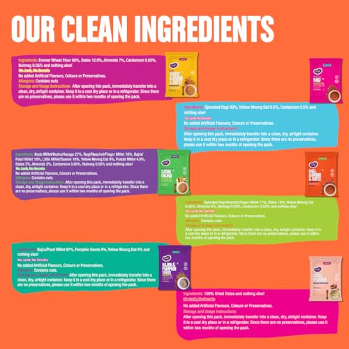 Pack 1: Sprouted Ragi Almond Date Makhana Cardamom Pack 2: 100% Dates;Pack 3: Instant Wheat Almond Dates Makhana Cardamom Pack 4: Bajra & Pumpkin Seeds;Pack 4: Sprouted Ragi Carrot Dates Almonds Makhana Cardamom Pack 5: Sattu maavu - Organic Ragi/ Finger