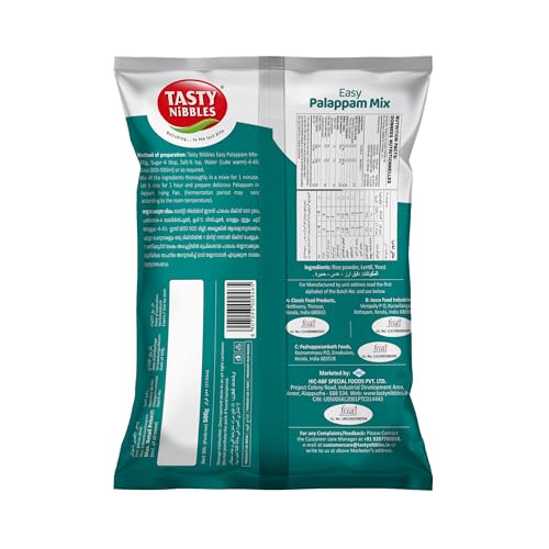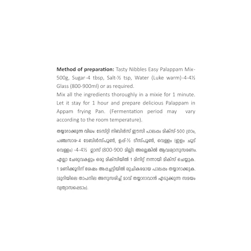 Method of preparation: Tasty Nibbles Easy Palappam Mix- 500g Sugar-4 tbsp Salt-½ tsp Water (Luke warm)-4-42 Glass (800-900ml) or as required. Mix all the ingredients thoroughly in a mixie for 1 minute. Let it stay for 1 hour and prepare delicious Palappam in Appam frying Pan. (Fermentation period may vary according to the room temperature).