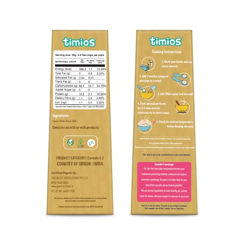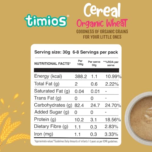 Organic Wheat is made using a cleanroom technology that provides the cleanest environment by controlling air and temperature which in turn controls all the airborne pollutants like dust and microbes. Organic Wheat first sprouted and carefully roasted in an even temperature to ensure all the nutrients are intact and are easily digested by babies. It has no added sugar salt and preservatives. It can also be used with a drop of ghee to enhance flavor and nutrition.
