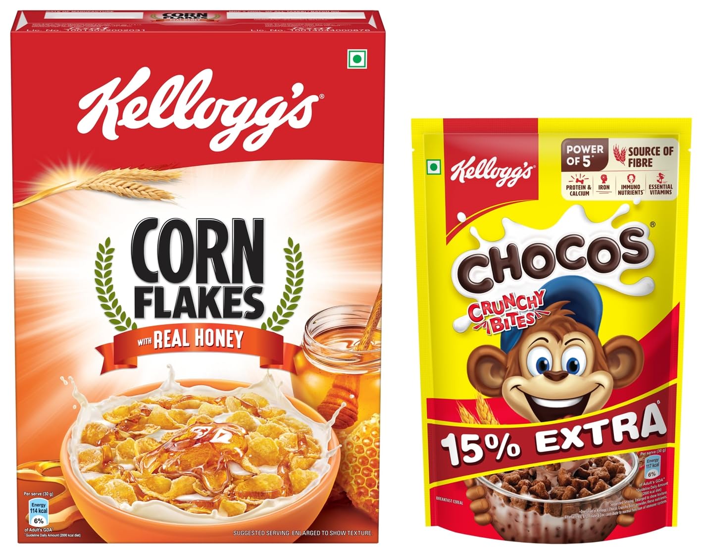Kellogg's Crunchy Bites | Source of Calcium High in Protein with 10 Essential Vitamins & Minerals Source of Fibre | Breakfast Cereal for Kids | 375g / 431g (Weight May Vary)KelloggChocos Crunchy Bites is a nourishing & solid breakfast for kids. It makes milk chocolaty & delicious. KelloggChocos Crunchy Bites is source of Fibre & Calcium. It is high in Protein and it is enriched with 10 essential vitamins & minerals like Iron Zinc B Vitamins & Vitamin C for your active kids.Kellogg's Cornflakes Real Honey 300g/345g | High in Iron Vitamin B1 B2 B3 B6 & C | Naturally Cholesterol Free | Corn Flakes Breakfast CerealKellogg's Corn Flakes with Real Almond is a tasty nourishing and wholesome breakfast at its very best. The goodness of almond inclusions with real honey can be tasted in every bite. Kellogg's Corn Flakes cereal is a nourishing and wholesome breakfast at its very best. It is prepared from actual natural corn with iron and 8 essential vitamins containing A C and B-Group vitamins it provides a balanced combination of nourishment.