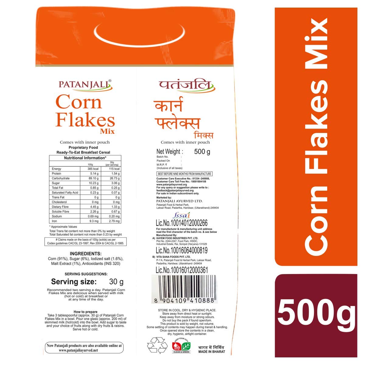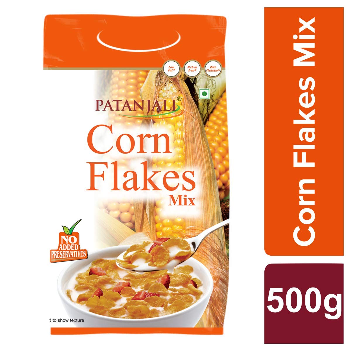 Patanjali Corn Flakes Mix are a popular breakfast cereal made by toasting flakes of corn which has all required essential vitamins and nutrients. it is low in fat, rich in iron and has zero cholesterol.Patanjali corn flakes are very good source of vitamins, minerals, folate, dietary fiber, as well as proteins, and carbohydrates.Patanjali Corn flakes are very rich in thiamine. Thiamine is good for carbohydrate metabolism, energy production and cognitive functions.Fiber helps to reduce cholesterol, constipation and the risk of colon cancer.Patanjali corn flakes are Very low in saturated fat and a gives a good satiety.Patanjali Cornflakes are very high source of iron content Iron, high iron diet is needed to maintain healthy blood level and help to keep the brain alert.Corn FlakesCorn GritSugarIodised SaltMalt ExtractBHA
