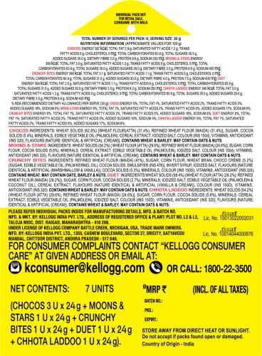 Kelloggchocos is a tasty chocolaty breakfast cereal for kids made with whole grain. It Is enriched with 11 essential vitamins and minerals. It has 1.5g of fiber for 30g low in fat and also high in calcium making Kellogg's chocos a good breakfast option for a great start to the school day.
