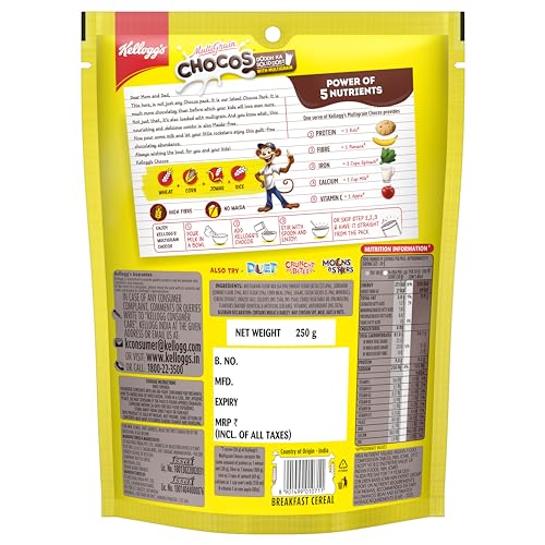 Kellogg's chocos is a nourishing & solid breakfast for kids. It makes milk chocolaty & delicious. Kellogg's chocos has the goodness of whole wheat. Each serving of 30g kellogg's chocos has protein and fibre equal to that of 1 wheat roti of 30g.