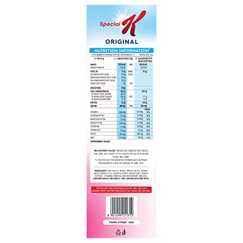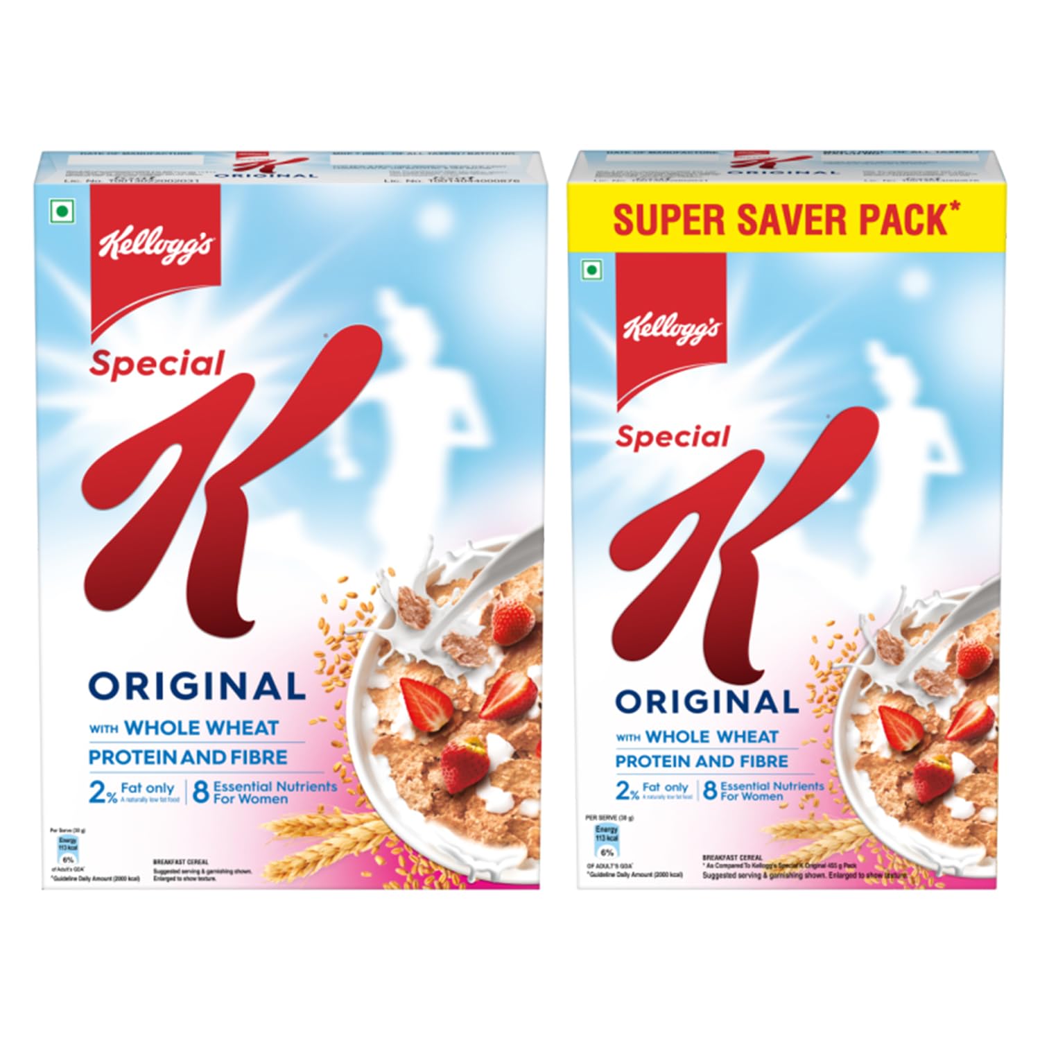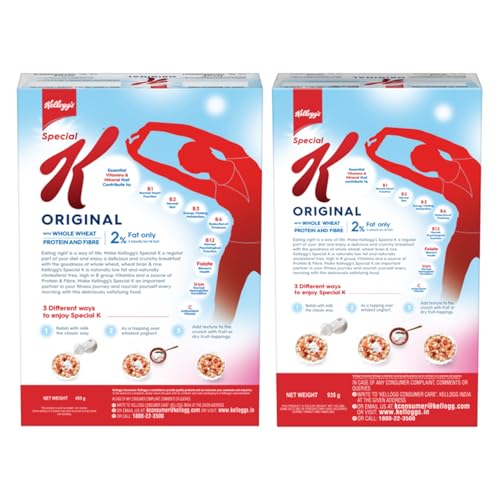 Kellogg's Special K Original Breakfast Cereals 900gp>KelloggSpecial K is a delicious low fat ready-to-eat cereal with the goodness of whole wheat and bran. It's high in B group vitamins and vitamin C and it's a source of protein & fibre.Relish it with skimmed milk or whisked yoghurt (dahi) along with your favourite fruits or dry fruits.Start each day with this tasty breakfast cereal and see if you feel the difference for yourself!Claims made basis CODEX Guidelines for use of Nutrition and Health claims. CAC/GL 23-1997.Kellogg's Special K Original Breakfast Cereals 435gKellogg's Special K Original Breakfast Cereals 435g