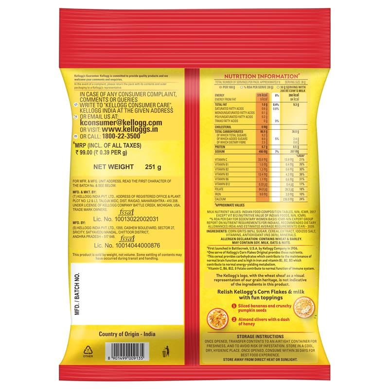 Kellogg's Corn Flakes cereal is a nourishing and wholesome breakfast at its very best. It is prepared from actual natural corn with iron and 8 essential vitamins containing A C and B-Group vitamins it provides the balanced combination of nourishment and original corn flavor. It is a convenient breakfast option that gives energy even after 3 Hours.