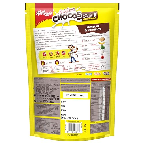 HomeGroceryHealthy BreakfastFlakesKellogg's Multigrain Chocos 385G | Multigrain Energy More Chocolatey | No-Maida | Power Of 5 Nutrients Protein Fibre Iron Calcium Vitamins | Kids Breakfast Cereal