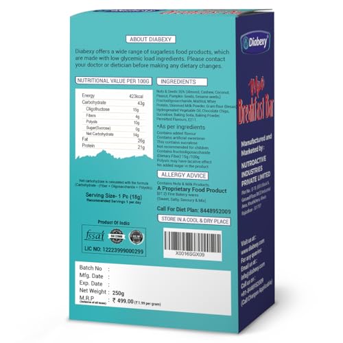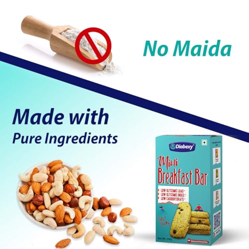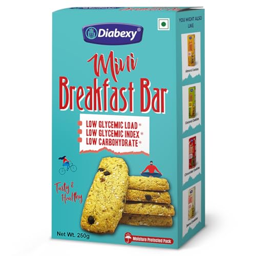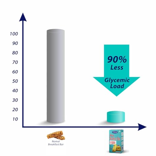 • LOW GLYCEMIC LOAD - The Estimated glycemic load of Rusk or Maida Cookies ranges between 50-60 per 100 gm. Estimated glycemic load of Diabexy Diabetic Breakfast Bar is just 4 per 100g which is 90% lesser than other options like rusk and cookies. It means t