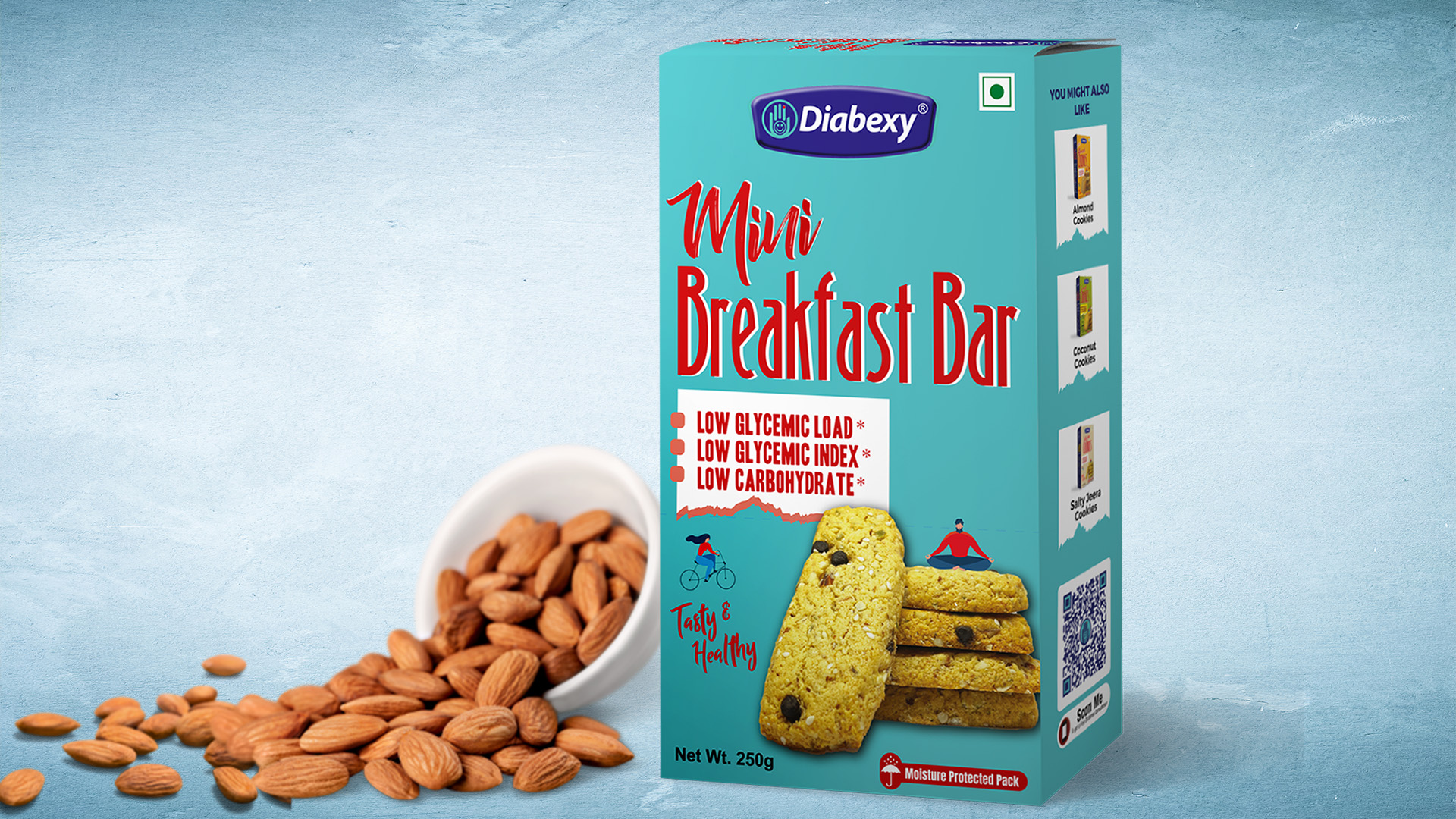 Diabexy is a diabetic food product brand which provides Low Glycemic load food products for diabetic persons. Glycemic load of a food item is an important nutritional parameter because it suggest that how much quantity of a food item will lead to how much increase in blood sugar level. We can mathematically calculated and estimate the glycemic load of a food product. 1 glycemic load is equal to 1gram glucose and 1gram glucose will increase blood sugar by 20 points. Estimated Glycemic load of suji rusk is 56 per 100g which means it will increase blood sugar by 1120 points. Estimated Glycemic load of Diabexy Breakfast Bar is just 4 which means it will increase blood sugar level by just 80 points. It means that Diabexy breakfast Bar is having 90% less impact on blood sugar level than normal suji rusk. One must control his daily dietary glycemic load to manage diabetes. Every bite of food is important for managing blood sugar level of a diabetic person. Early morning tea time snack is very important to keep blood sugar level under check. Diabexy Diabetic Breakfast Bar is an extremely Low Glycemic Load morning tea snack especially designed for a diabetic person. Replace your Rusk with Diabetic Breakfast Bar because it has very low glycemic load. You can dunk the Diabexy breakfast bar in to tea the way you dunk rusk. Our mission at Diabexy is to help people to live a diabetes free life. It took us more than 10 years of research and development to develop Low Glycemic Load food products. We believe that it is possible to reverse diabetes with the help of healthy eating habits and disciplined lifestyle.