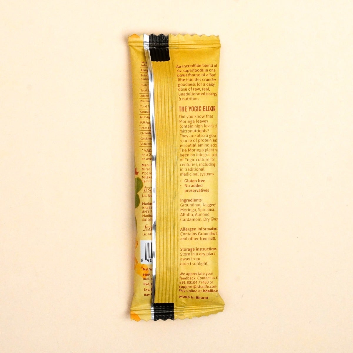 Embrace the joy of guilt-free snacking with Isha Life! Introducing nutrient-dense delights crafted from highly pranic ingredients and steeped in yogic wisdom.This powerhouse of a bar is an incredible blend of six superfoods including groundnut, spirulina, alfalfa, almond, jaggery, cardamom, and dry ginger. It also contains Moringa, a yogic wonder. For centuries, it has been an integral part of yogic culture and ancient medicinal systems. Moringa is rich in micronutrients, protein, and essential amino acids. With no added preservatives, oil, gluten, refined sugar, or artificial ingredients, this pack of 10 bars is a power-packed treat perfect for sharing with your family and friends.