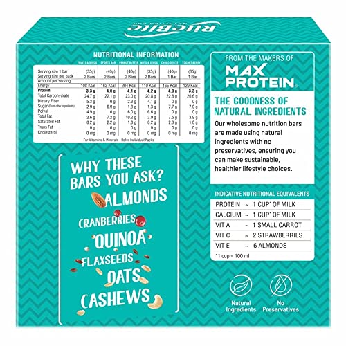 RiteBite Max Protein Daily Assorted 10g Protein Bars (Pack of 6)Max Protein Daily Assorted - Choco Almond x 2 Choco Berry x 2 Choco Classic x 2 (Pack of 6) 300gRiteBite Max Protein Nutrition Assorted Bar375g (Choco Delite-1 * 40g Yogurt Berry-1 * 35g Peanut Butter-2 * 40g Fruits & Seeds-2 * 35g Nuts & Seeds- 2 * 35g Sports Bar-2 * 40g) (Pack of 10)A BAR FOR EVERYONE: With high protein & fiber Max Protein bar is the perfect bar for your hectic lifestyle with no preservatives with a balance of taste and health and being 100% vegetarian. SUSTAINED ENERGY: Max Protein bars are your go to performance energy bar purposefully crafted with an ideal mix of 3 protein blends of whey protein soy and casein for sustained energy. WHOLESOME INGREDIENTS FOR A WHOLESOME EXPERIENCE: A bar that satiates your hunger and keeps you going with hrs of sustained energy. We aim to keep you healthier and provide a healthier option to your food choices with an irresistible combo of nutrition and flavor YOUR ENERGY BUDDY: No time for breakfast before the video call? Need something energy boost for the grocery run? Got that midnight movie craving? Choose the healthier Max Protein bars as your energy and nutrition buddy. Don't skip on your health and weight goals. Have this bar handy for all the time whenever bored or binge eating hits you. MADE IN INDIA : Max Protein is the first brand to launch nutrition & protein bars in India. We have created and nurtured protein bars category in Indian Market.