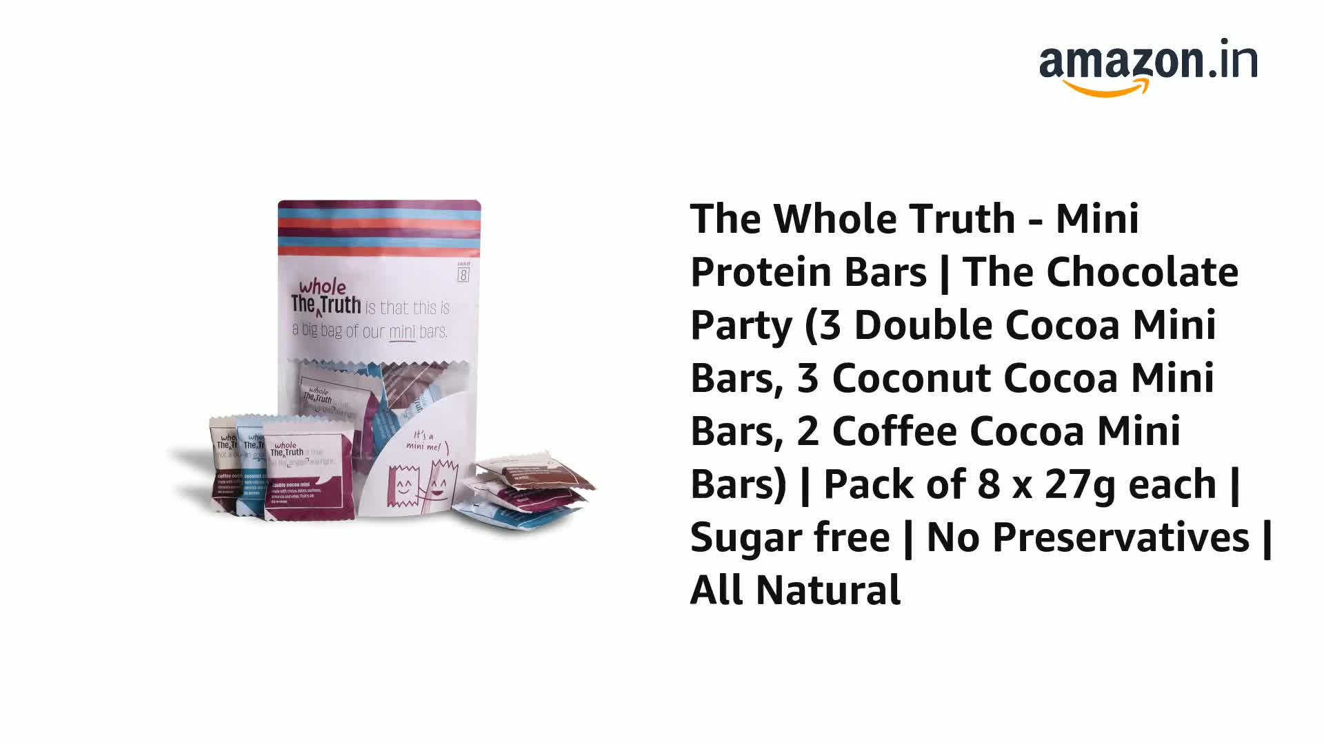HomeGroceryHealthy BreakfastHealth BarThe Whole Truth - Mini Protein Bars | The Chocolate Party (3 Double Cocoa Mini Bars 3 Coconut Cocoa Mini Bars 2 Coffee Cocoa Mini Bars) | Pack of 8 x 27g each | Sugar free | No Preservatives | All Natural