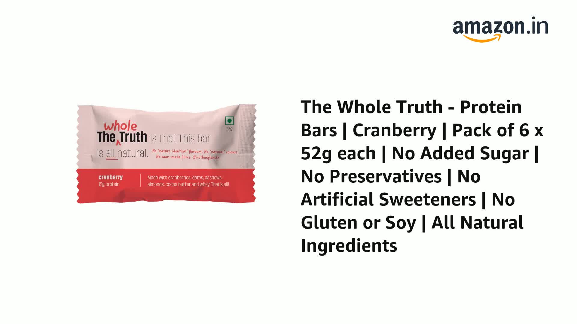 HomeGroceryHealthy BreakfastHealth BarThe Whole Truth - Protein Bars | Cranberry | Pack of 6 x 52g each | No Added Sugar | No Preservatives | No Artificial Sweeteners | No Gluten or Soy | All Natural Ingredients