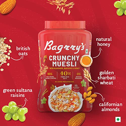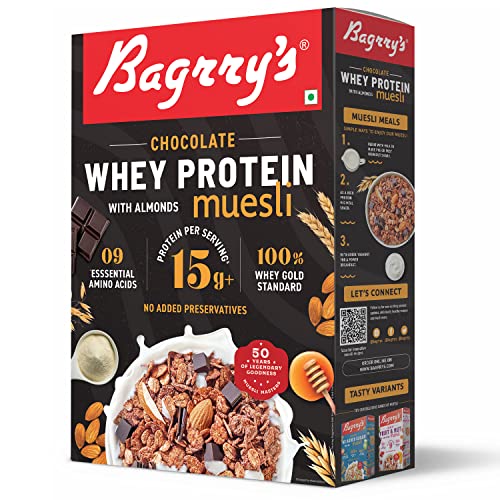 Bagrry's Crunchy Muesli | 40% Fibre Rich Oats with Bran | 82% Multi Grains Almonds Raisins & Honey | Breakfast Cereal | Natural Muesli 1000g JarBagrry's Crunchy Muesli is inspired by the original Swiss muesli recipe! Made with the finest ingredients from across the world such as 100% Imported Whole Oats Californian Almonds Succulent Raisins Natural Honey Crispy Whole Wheat and Golden Corn Flakes along with goodness of added fibre rich Bran. This Multigrain muesli is as delicious as it is nourishing and it's a perfect way to start your day.Bagrry's Whey Protein Muesli |15gm Protein Per Serve |Chocolate Flavour|Whole Oats & Californian Almonds|Breakfast Cereal|Protein Rich|Premium American Whey Muesli 500gm BoxIntroducing a power packed muesli for all fitness enthusiasts with added Imported Whey Protein. A breakfast cereal that is high in protein with the goodness of Imported Oats American Whey and Californian Almonds & Soy Protein isolates. The first of its kind protein product that is high in fibre for easy digestion and is also all natural with no nasty additives.