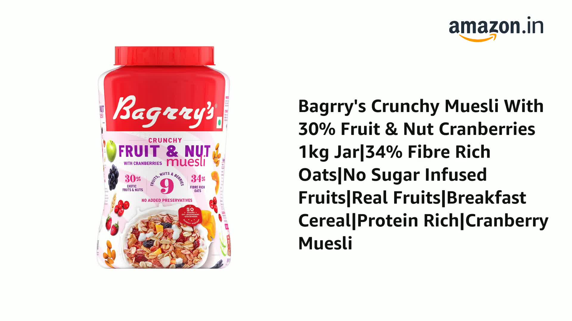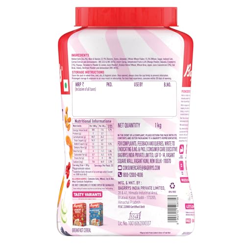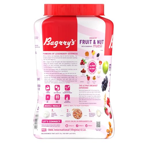 Bagrry's Crunchy Muesli With 30% Fruit & Nut Cranberries 1kg Jar|34% Fibre Rich Oats|No Sugar Infused Fruits|Real Fruits|Breakfast Cereal|Protein Rich|Cranberry Muesli