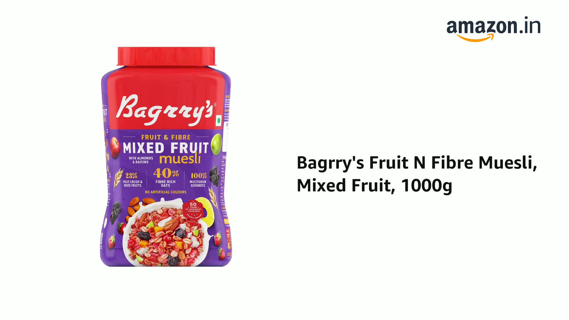 Make your mornings more delightful with Bagrry's Fruit n' Fibre - Mixed Fruit Muesli. Made with the perfect balance of whole grains such as Oats and Wheat Flakes along with mixed fruits. Experience the fruity flavours of luscious strawberries delicious apples and zesty pineapples coming together to make the most delicious breakfast cereal.