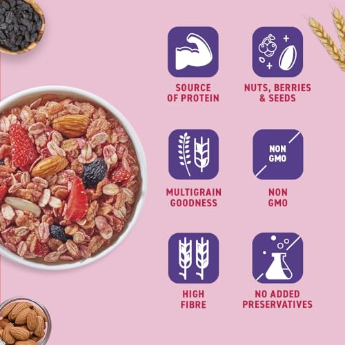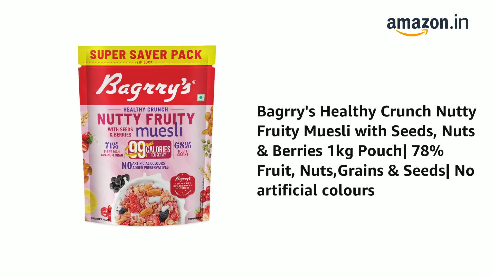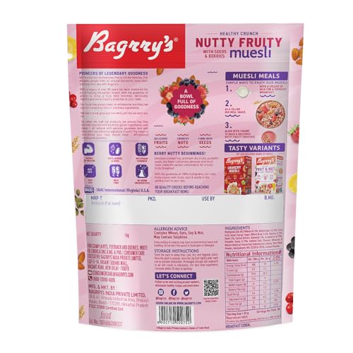 • REAL INGREDIENTS: Bagrry's Healthy Crunch Nutty Fruity Muesli has real fruits seeds berries & nuts. It has natural preservatives. So enjoy the goodness of real ingredients guilt free.