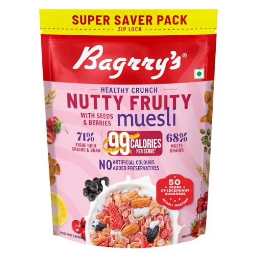 • NOURISHING AND TASTY BREAKFAST CEREAL: Say Hello to delightful nutritious breakfast with Bagrry's Healthy Crunch Nutty Fruity Muesli. It's a multigrain cereal that will give you nutritious start to your mornings & get you ready for the day. Bagrry's Healt