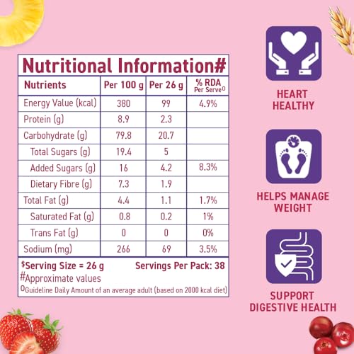 NOURISHING AND TASTY BREAKFAST CEREAL: Say Hello to delightful breakfast Bagrry's Crunchy Fruit & Nut Muesli with Cranberries/Cranberry filled with multigrain goodness that will jump-start your mornings and get you ready for the day. Bagrry's Crunchy Fruit & Nut Muesli with Cranberries/Cranberry has the goodness of multigrain 30% fruit & nuts and 34% fibre rich oats making for a nourishing and a delicious meal. Relish nourishment of 9 real fruit and nuts in your healthy breakfast.