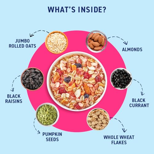 High in Protein & Fibre: Extensively researched and skilfully crafted with the perfect mix of various nutrient-rich grains like rolled oats golden Sharbati wheat flakes almonds raisins bran and berries makes our no added sugar muesli high in protein & fib