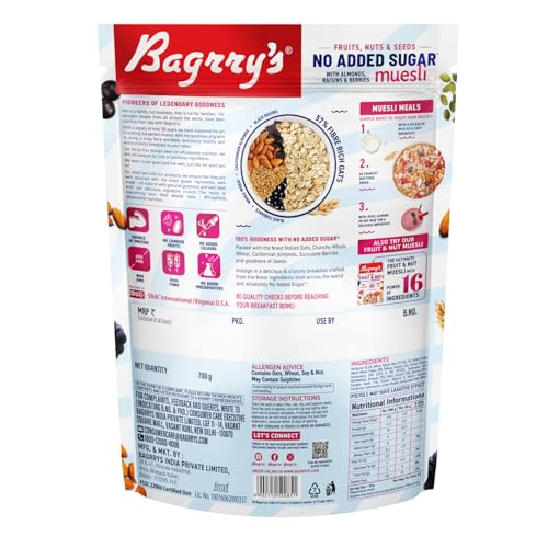 Bagrry's No Added Sugar Muesli Fruits, Nuts and Seeds 700 gm Pouch | Whole Grain Breakfast Cereal | Helps Manage Weight |0% Added Sugar Muesli | No Sugar infused Berries| No Added Preservatives | Almonds,Raisins & Berries