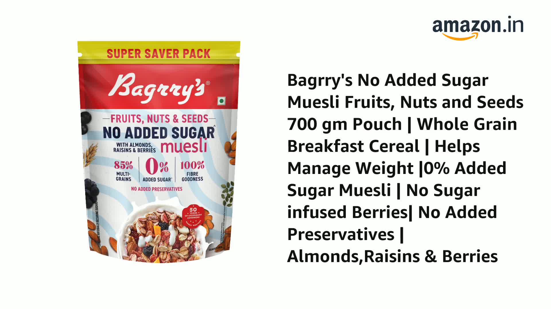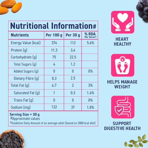 Sugar free start to your day with India's first No Added Sugar Muesli meticulously crafted with a delectable blend of fruits nuts and seeds featuring California almonds pumpkin seeds and black currants. Healthy & Sugar free start to your day.